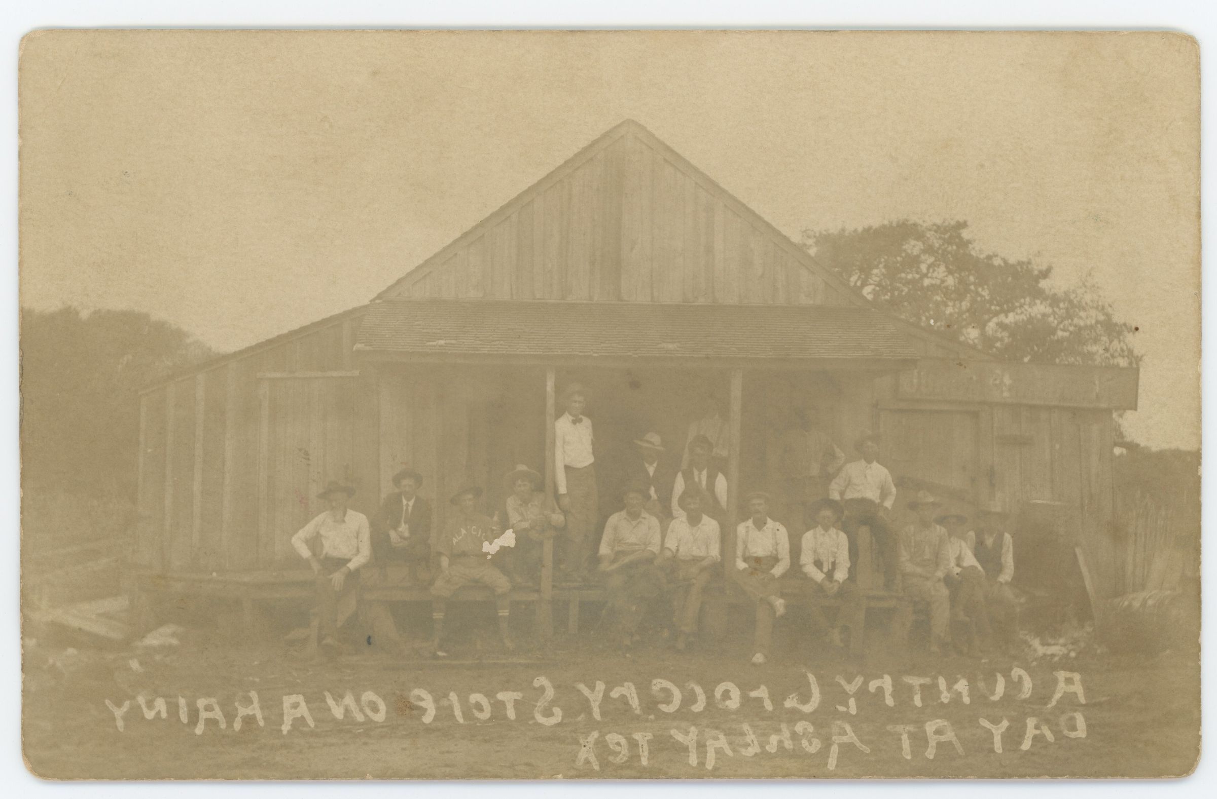 A group of men sitting on the front porch of W.E. Moore's Dry Goods. One of the men appears to be wearing a sports uniform with the name Palacios printed on the shirt. Ashby Ball Team.Collection