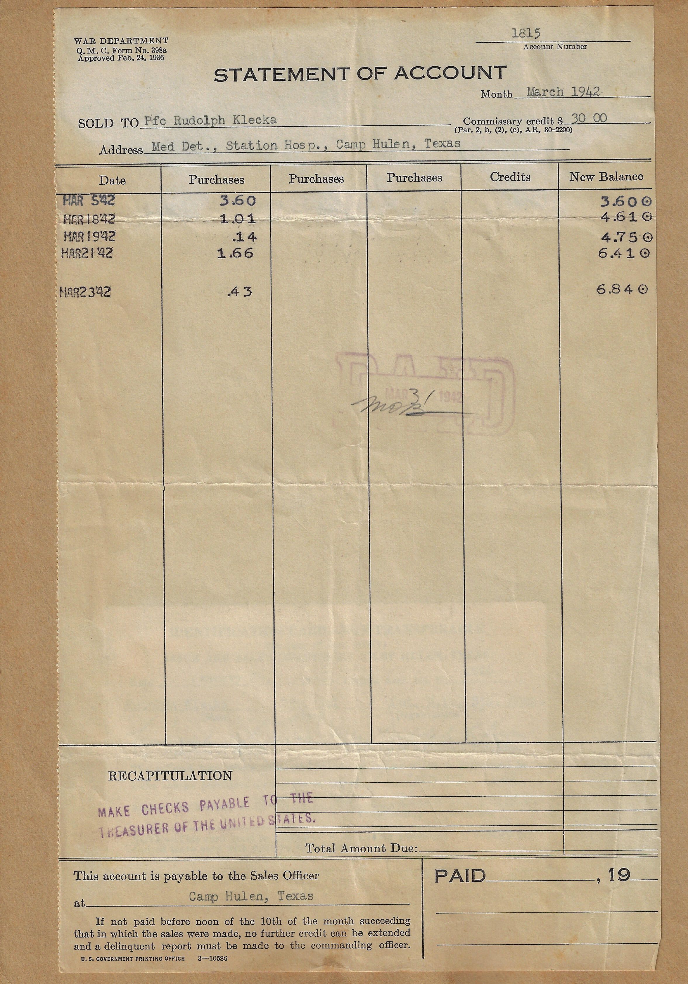 Account Statement. Station Hospital.