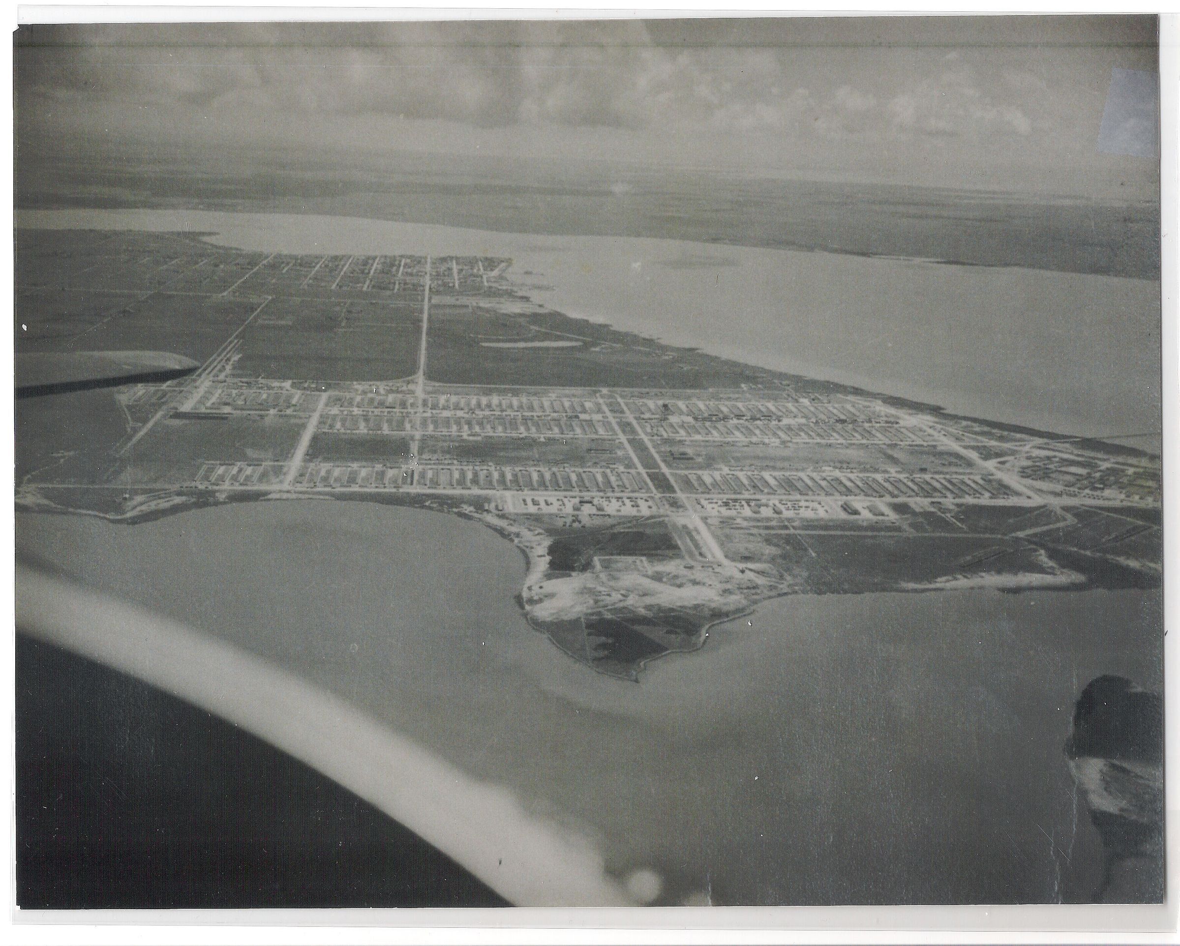 c. 1941 View of the Camp with Palacios in the middle distance. Photo made from a civilian airplane after the 1930-41 expansion of the Camp's facilities to accommodate the antiaircraft training role. Turtle Bay in foreground.Collection