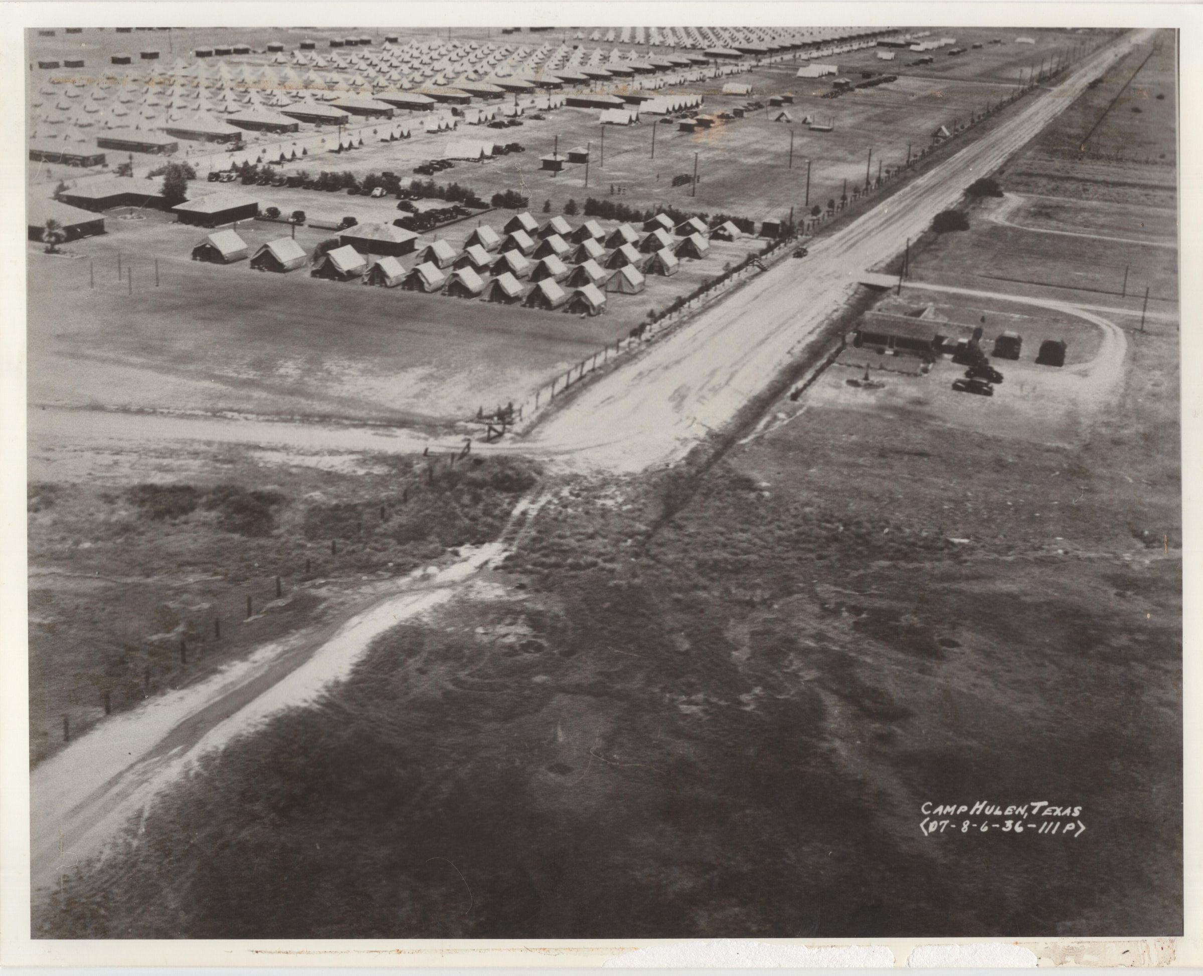 Middle center are tents of Division's Commanding General and his headquarters staff officers. Division headquarters and officers' mess were in building to left of tents. Upper corner is cantonment area of 141st Infantry Regiment. At very top, middle right, is counterpart area of 142nd Infantry Regiment. Tres Palacios Bay is underneath the aircraft from which photo was made.Made/Created