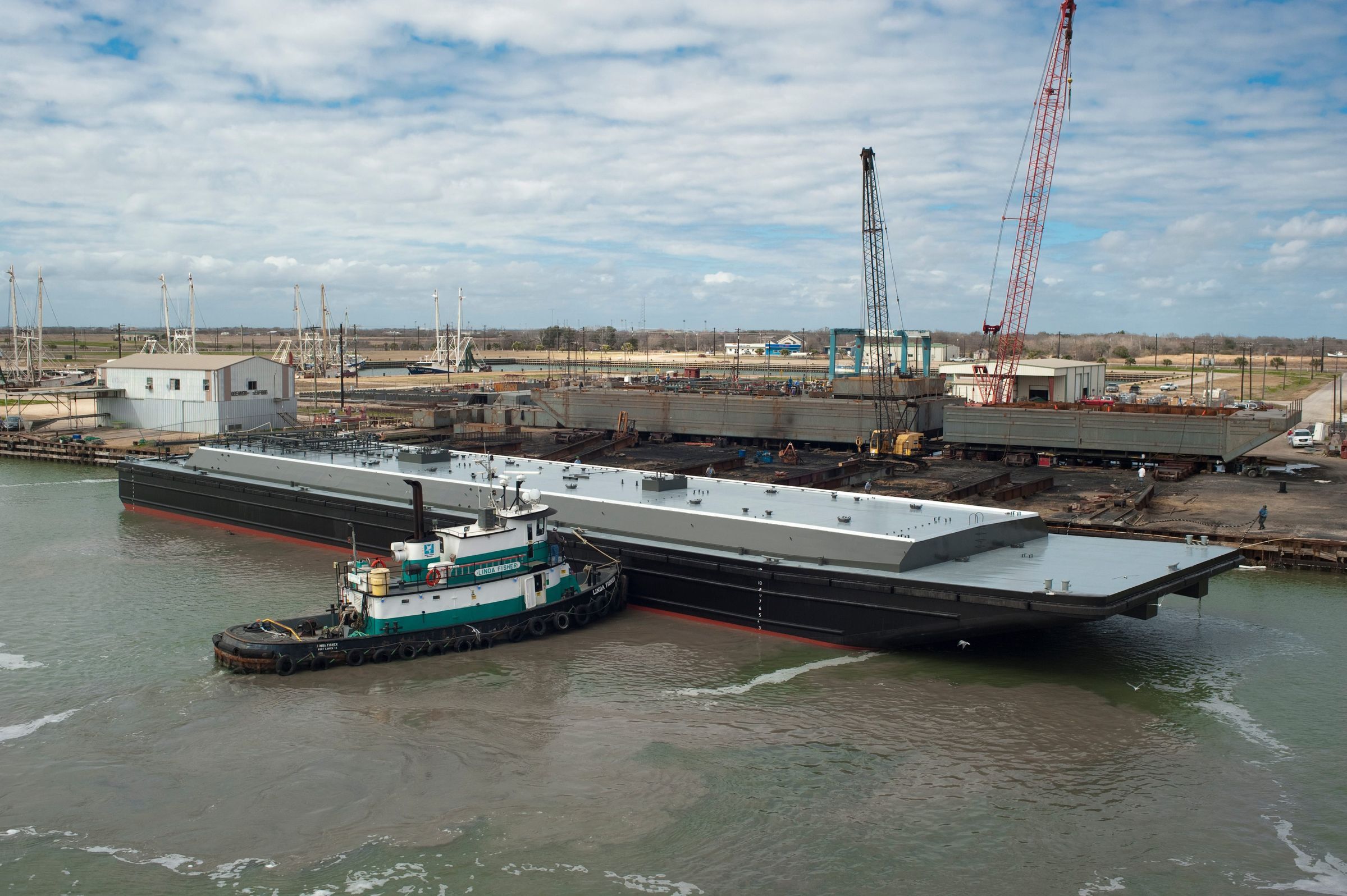 After the barge was launched, the push boats were guiding it out to the bay.