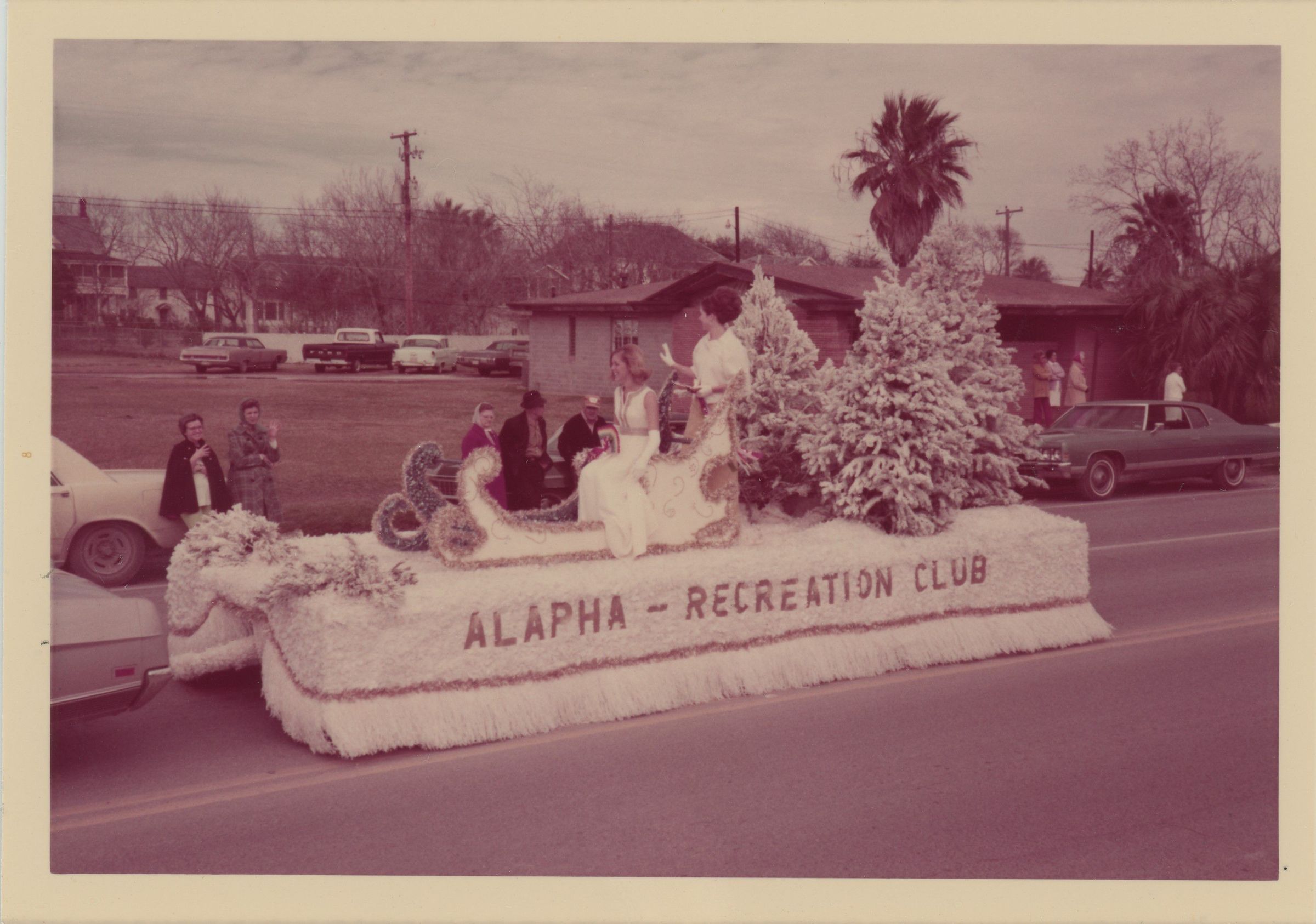 A white float made by the Alapha Club. The float was being pulled by a vehicle on Main Street during the Valentine Parade.