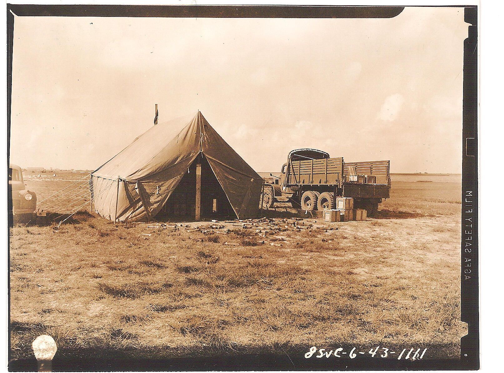 One of the sections of the area in which the Ordinance unloads defective ammunition at Camp Hulen, Texas. On the truck is the live ammunition as it it brought into the area. in the tent is stored the brass after cleaning.Collection