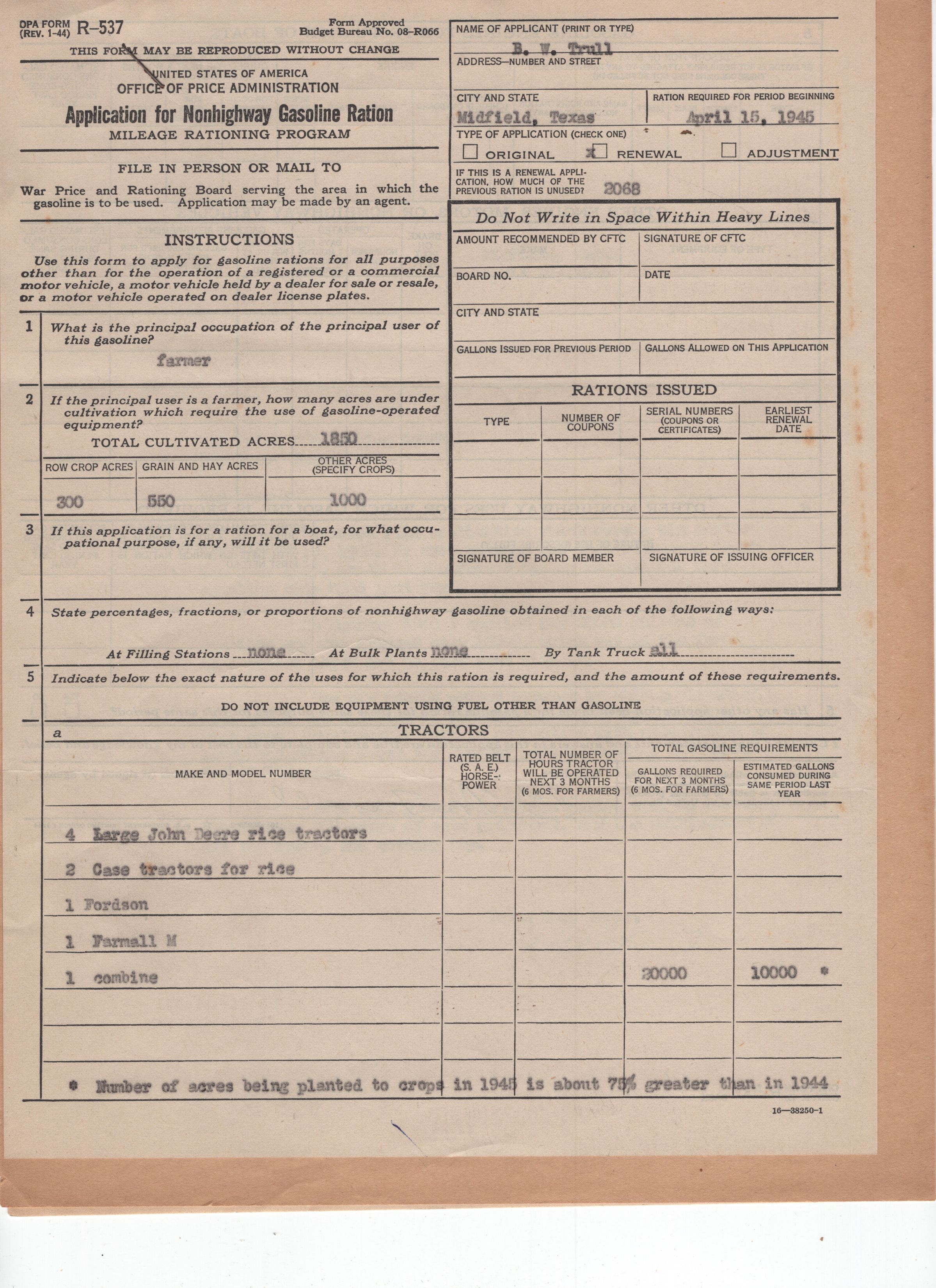 Application for nonhighway gasoline ration