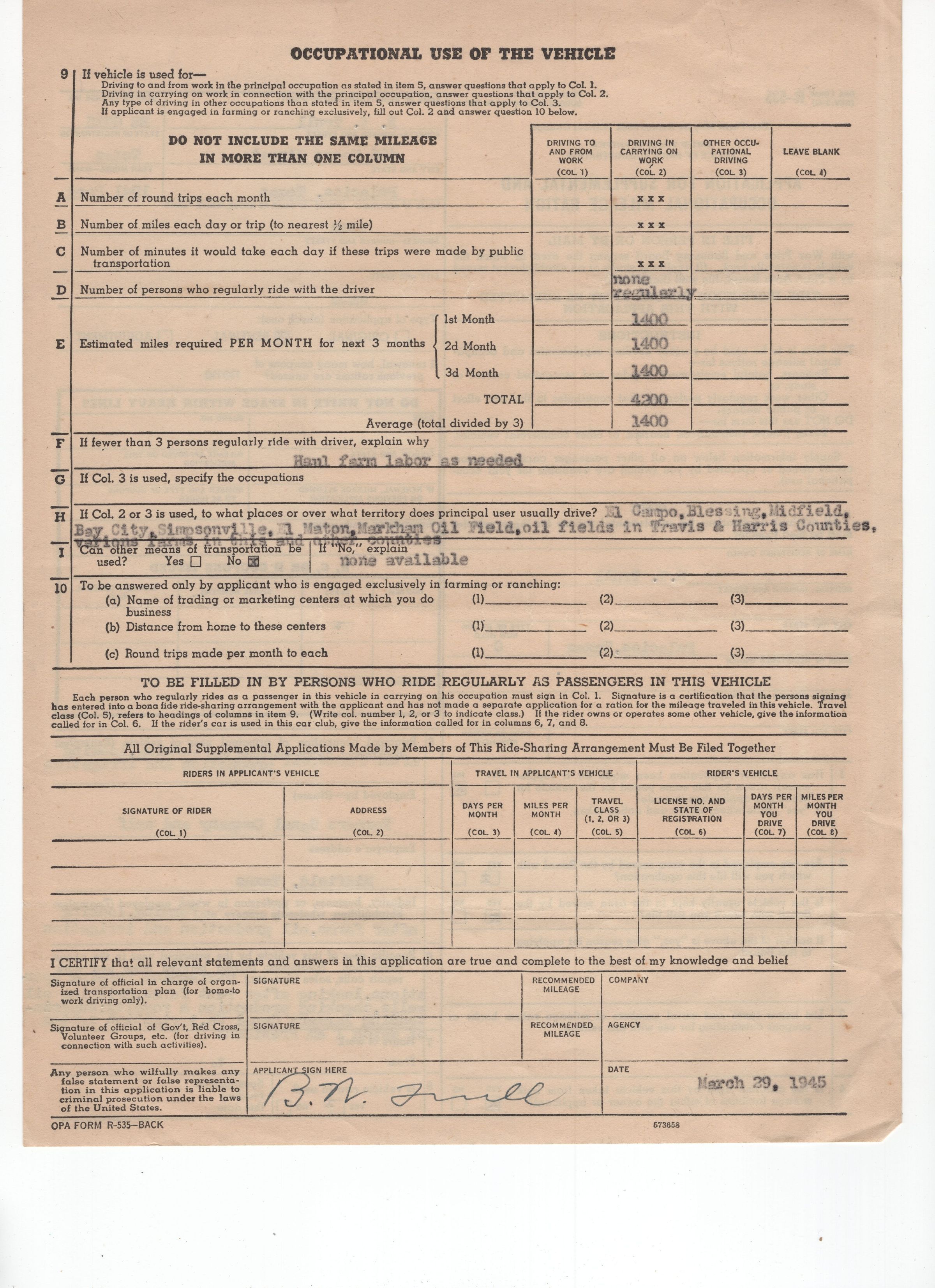 Application for Supplemental and Occupational Mileage Ration
