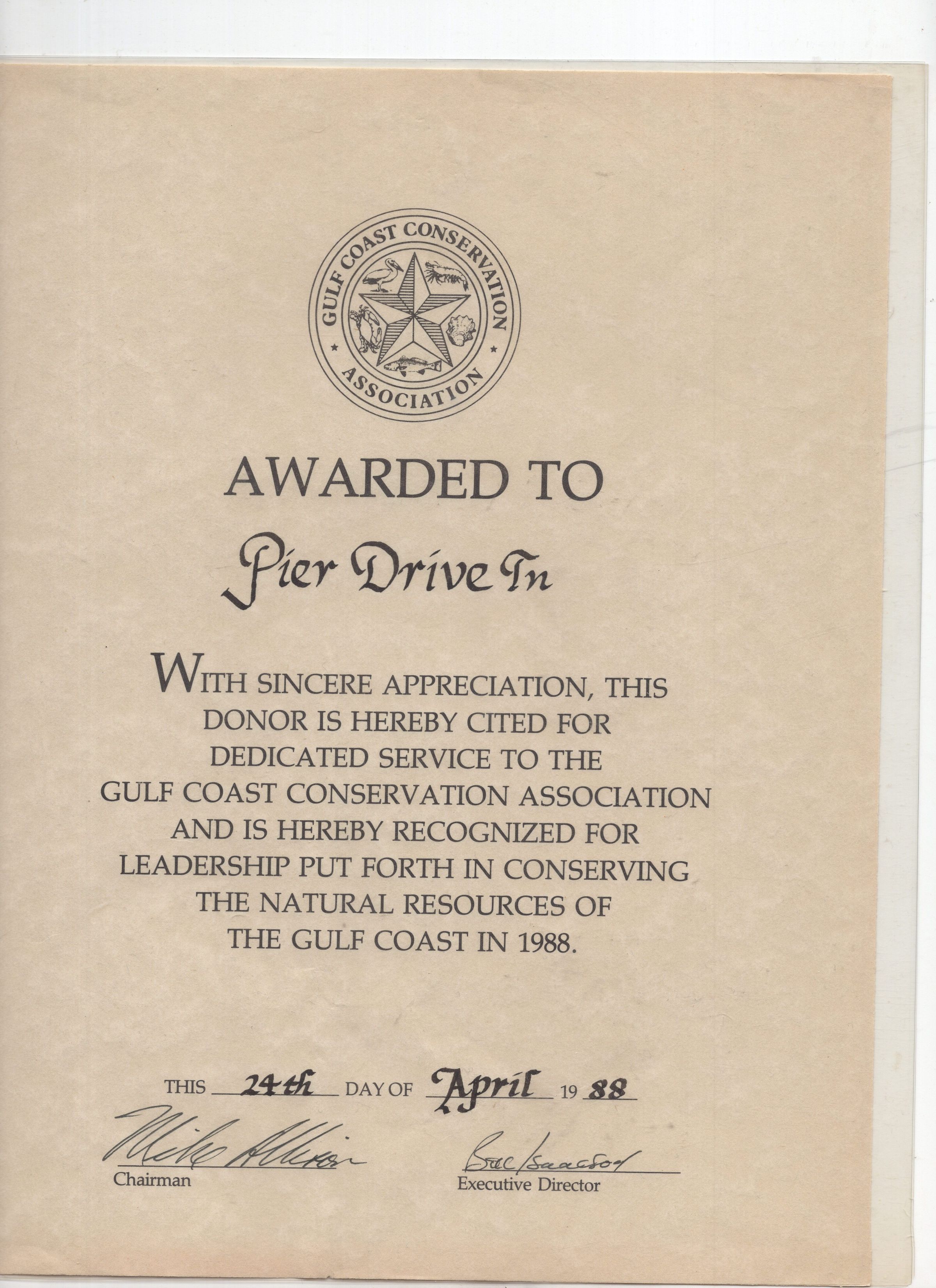 Award to the Pier Drive-In for their dedicated service to the Gulf Coast Conservation Association and is hereby recognized for leadership put forth in conserving the natural resources of the gulf coastCollection