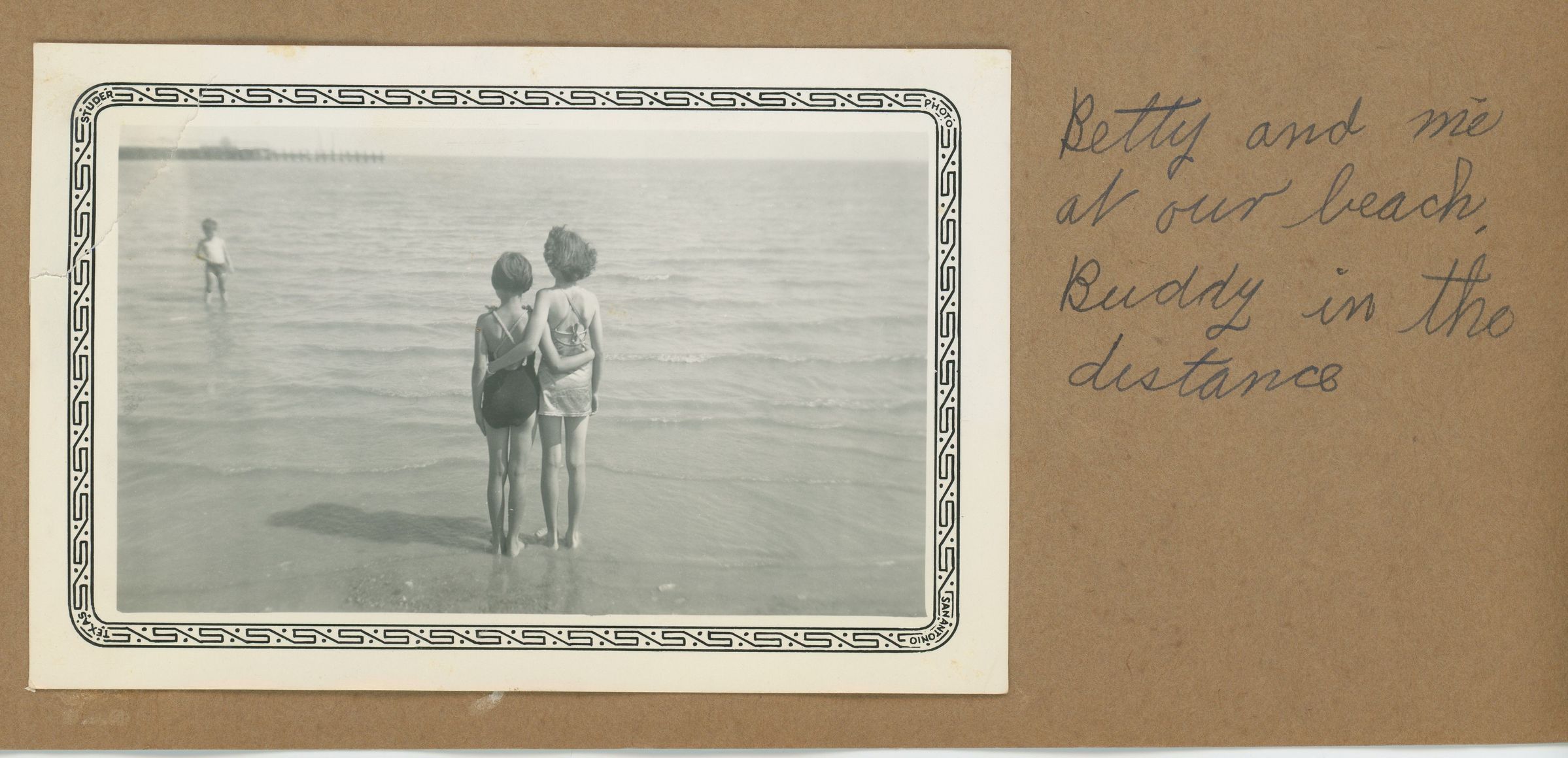 2 girls in swimsuits standing in the water with a boy in a distance.