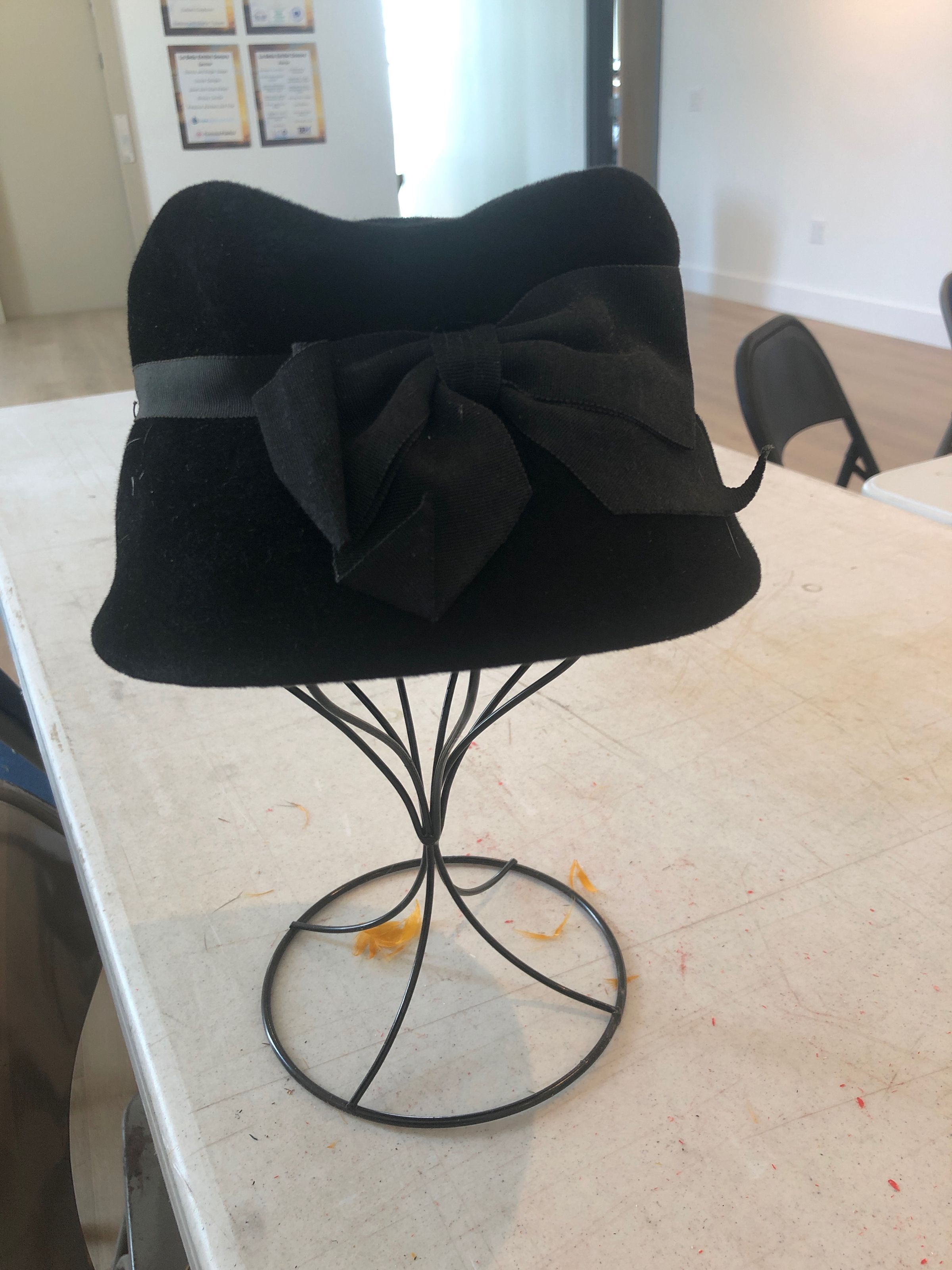 Black felt hat with a black ribbon wrapping around the hat and a large black bow in the frontCollection