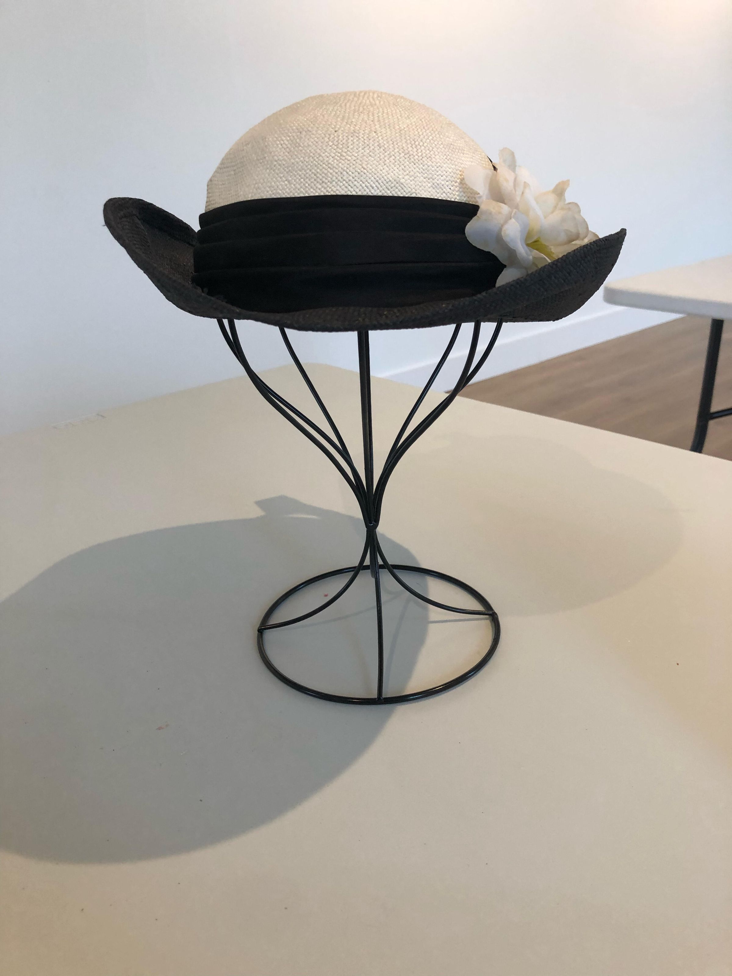 Black & white straw hat with a white fake flower, black & white feather, and a black ribbon