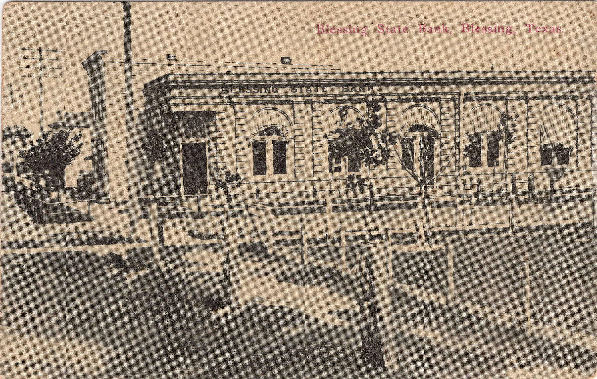 Bank built between 1905 and 1907. Added onto in 1908. Note the fence around Hotel Blessing.