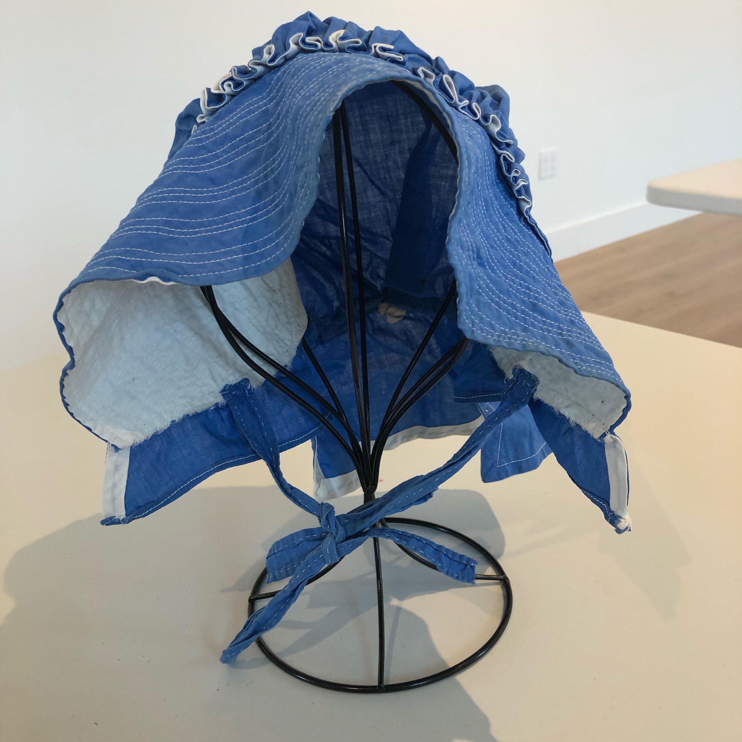 Blue bonnet with a tie that secures it to the head, white interior on the sides of the bonnet piece, and ruffles with blue/white fabric on top and white lines along the length of bonnetCollection