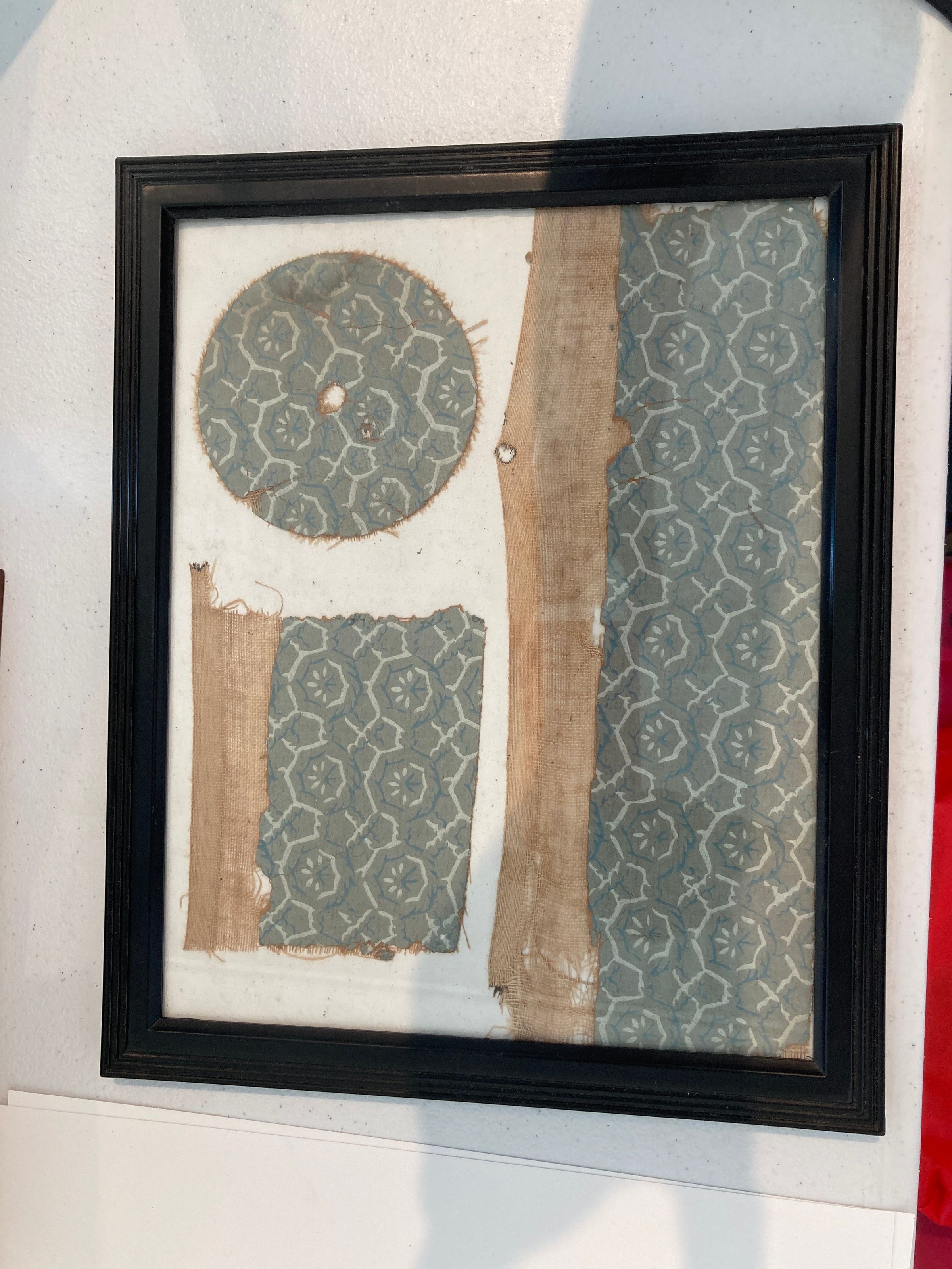 Blue wallpaper with light blue and white patterns.