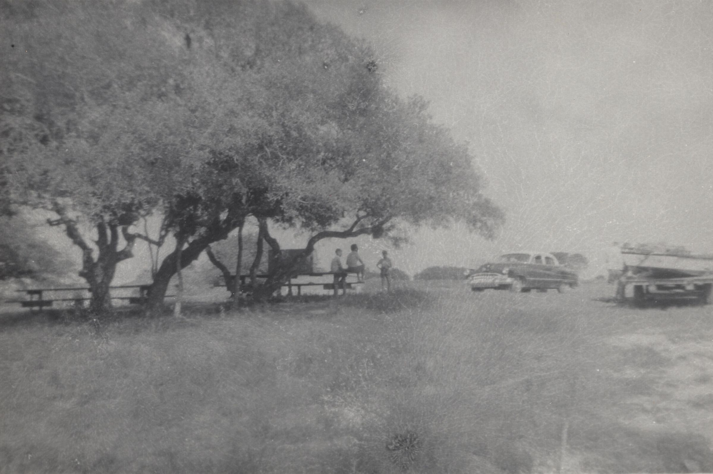 Boys sitting on picnic tables