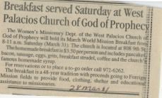 Breakfast served Saturday at West Palacios Church of God of Prophecy