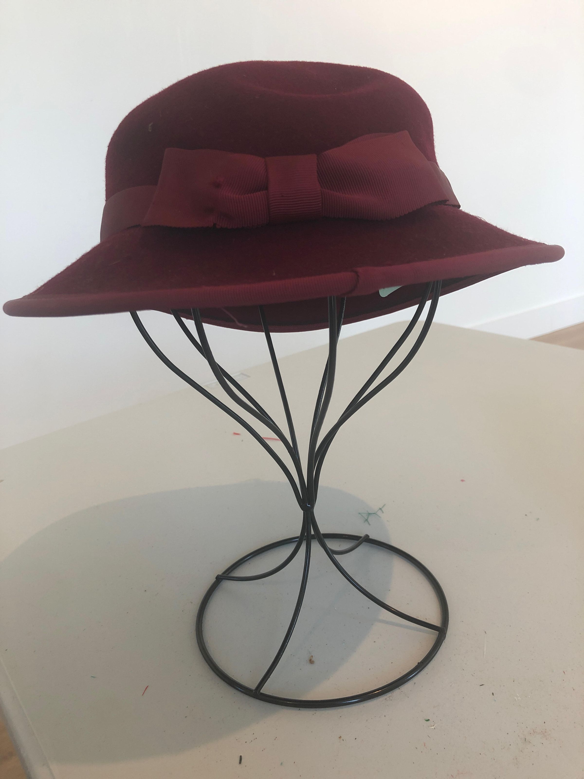 Burgundy velvet hat with a similar colored bow, ribbon, and fishnet on the topCollection