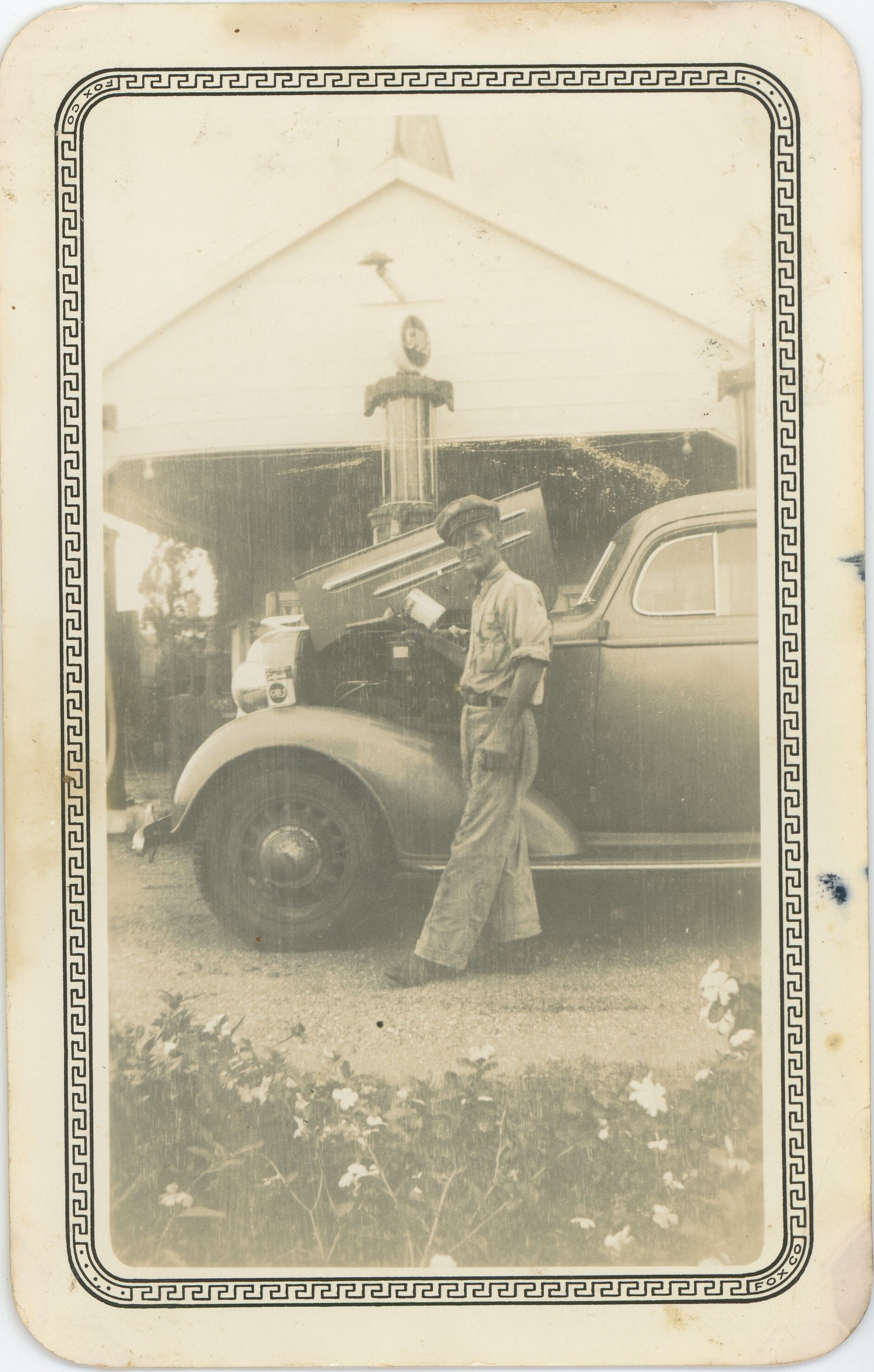 C.L. Dorsey standing in front of car at Dorsey Gas Station.