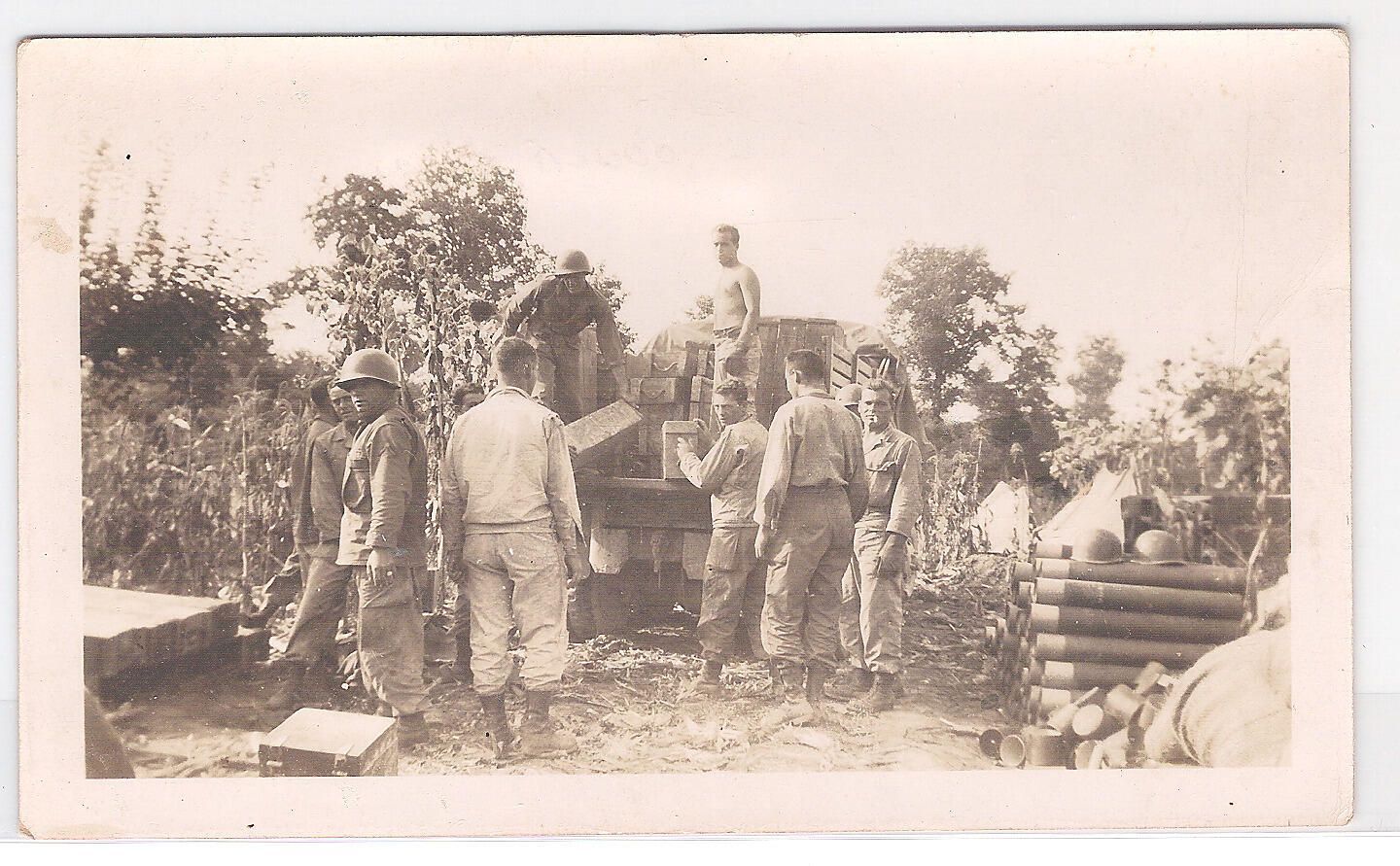 Re-supply detail. After heavy firing mission, somewhere in Italy 1944 or 45. Note the empty cases ____________ at right. In winter and muddy areas, these were sometimes used to make walkways.