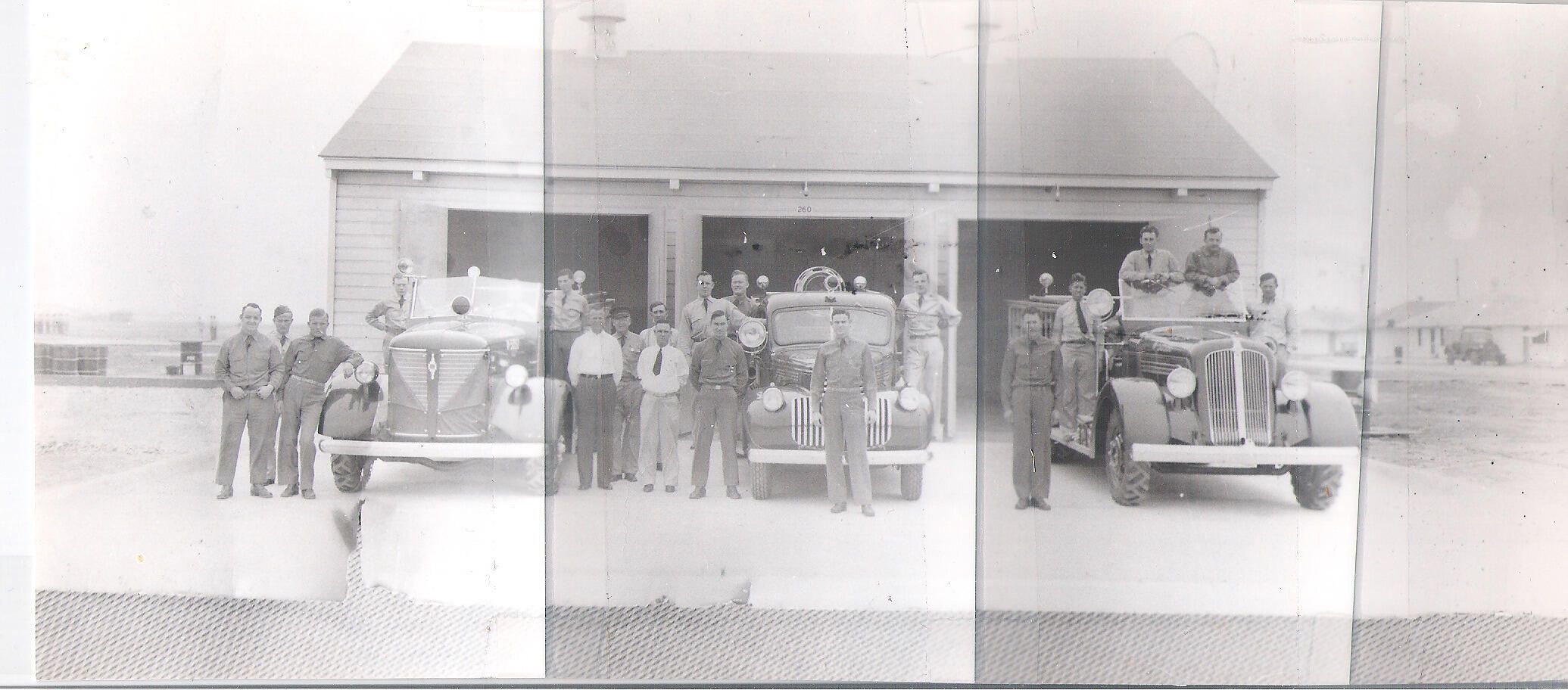 Four photographs taped together to give a wide view of the firefighters and engines at Camp Hulen. In total there are three fire trucks and all have men hanging on their sides for the picture.Collection