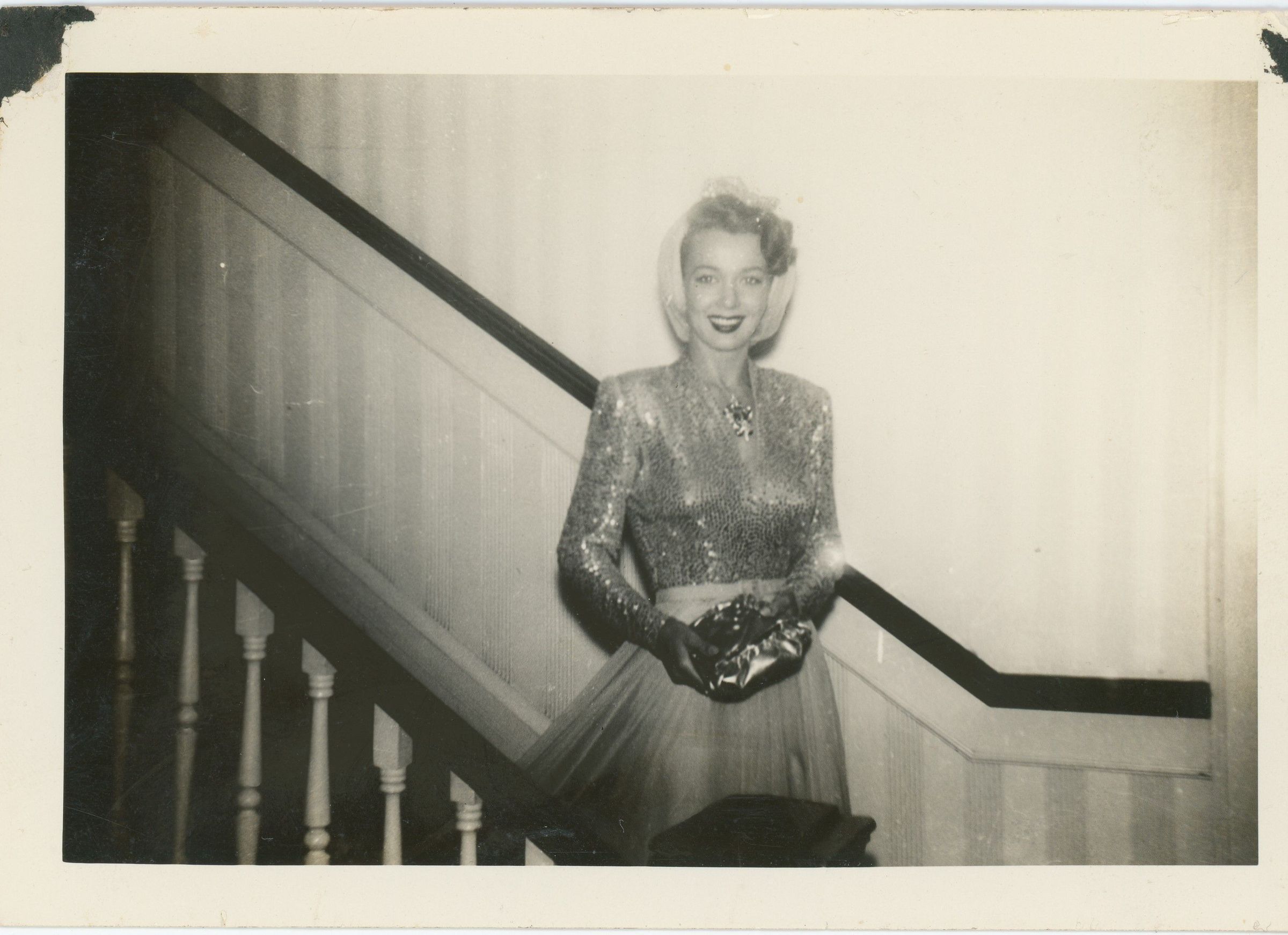 Actress Carole Landis standing on the stairs in the lobby of the Luther Hotel.