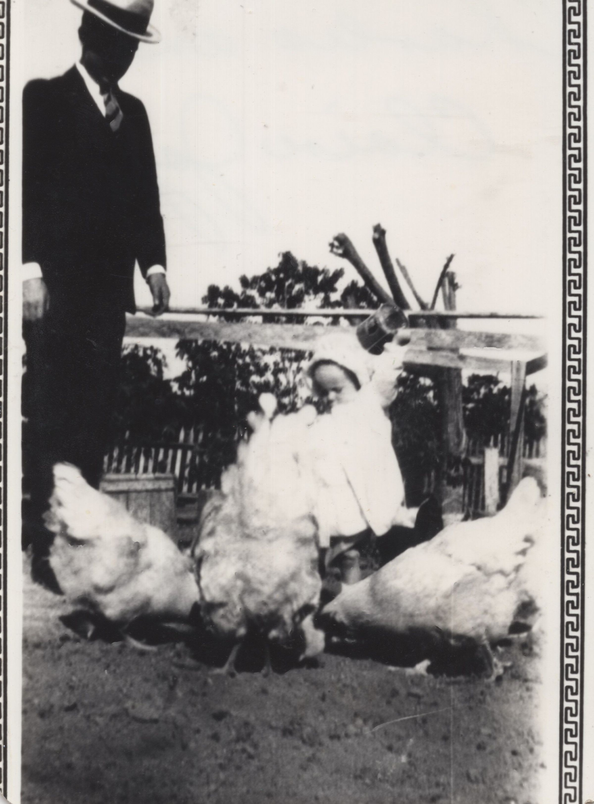 Charles and a toddler Claire Joy feeding chickens