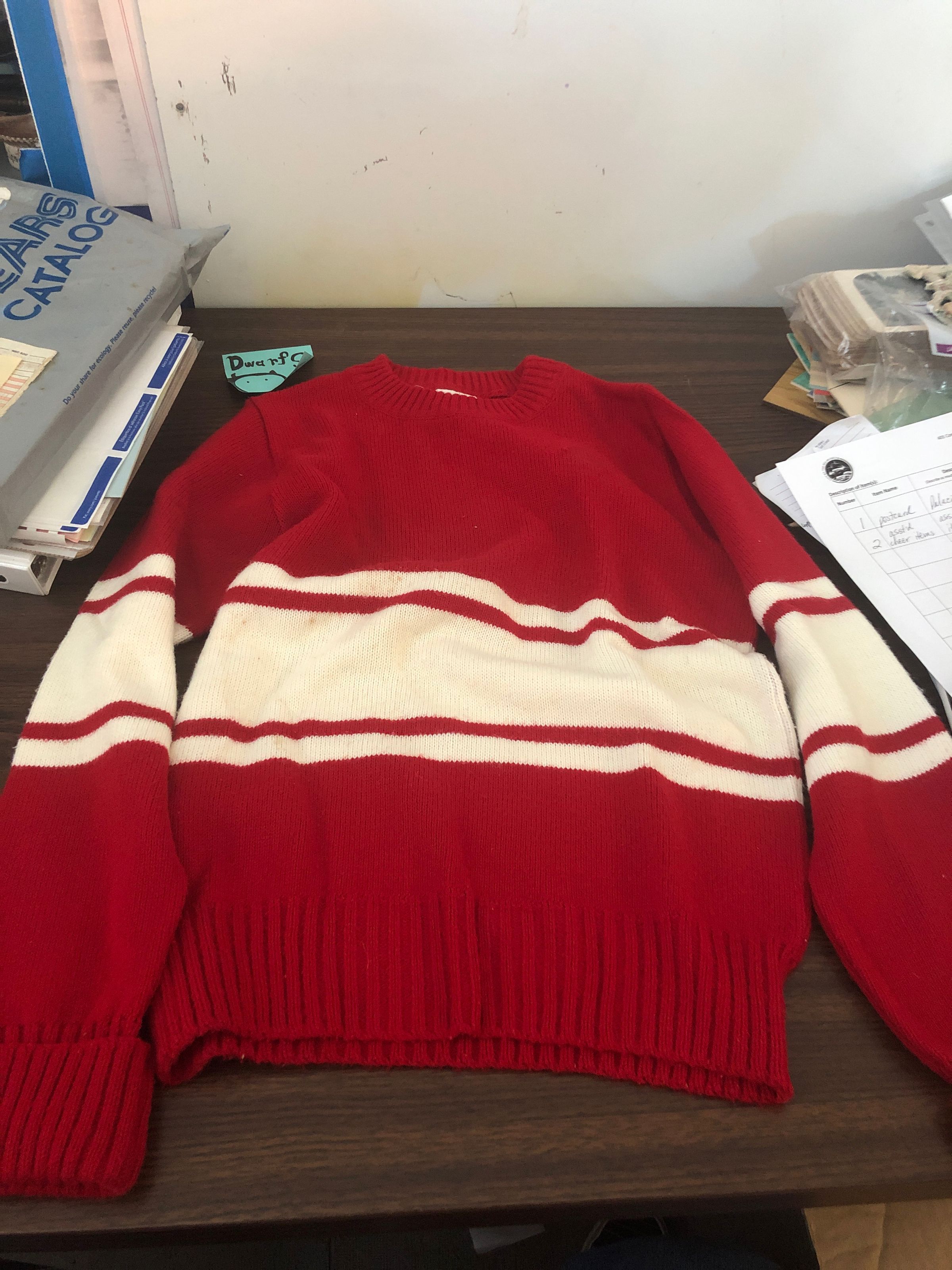 Red & white sweater worn by Palacios High School cheerleaders, more than likely whenever it was a cold weather game