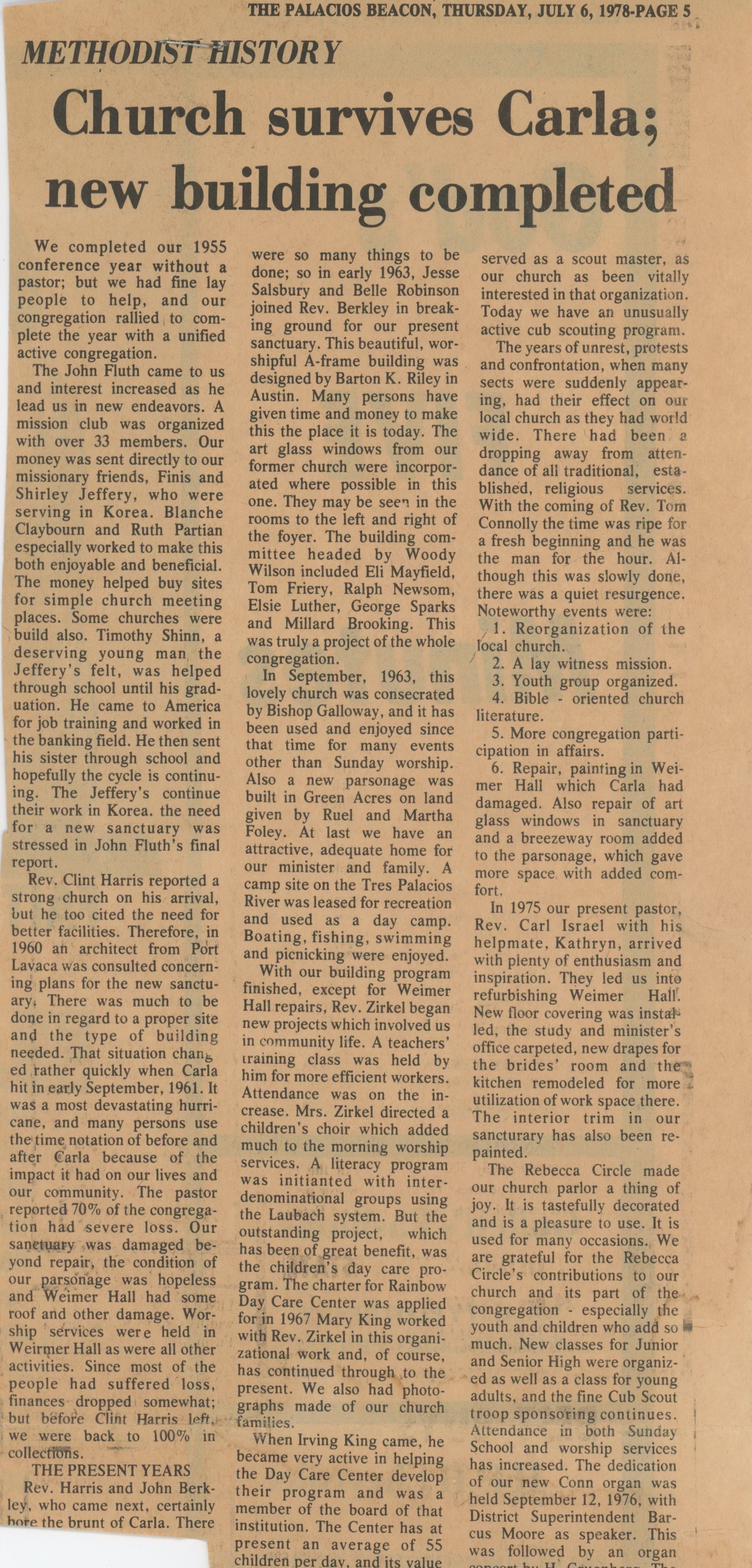 Church survives Carla; new building completed