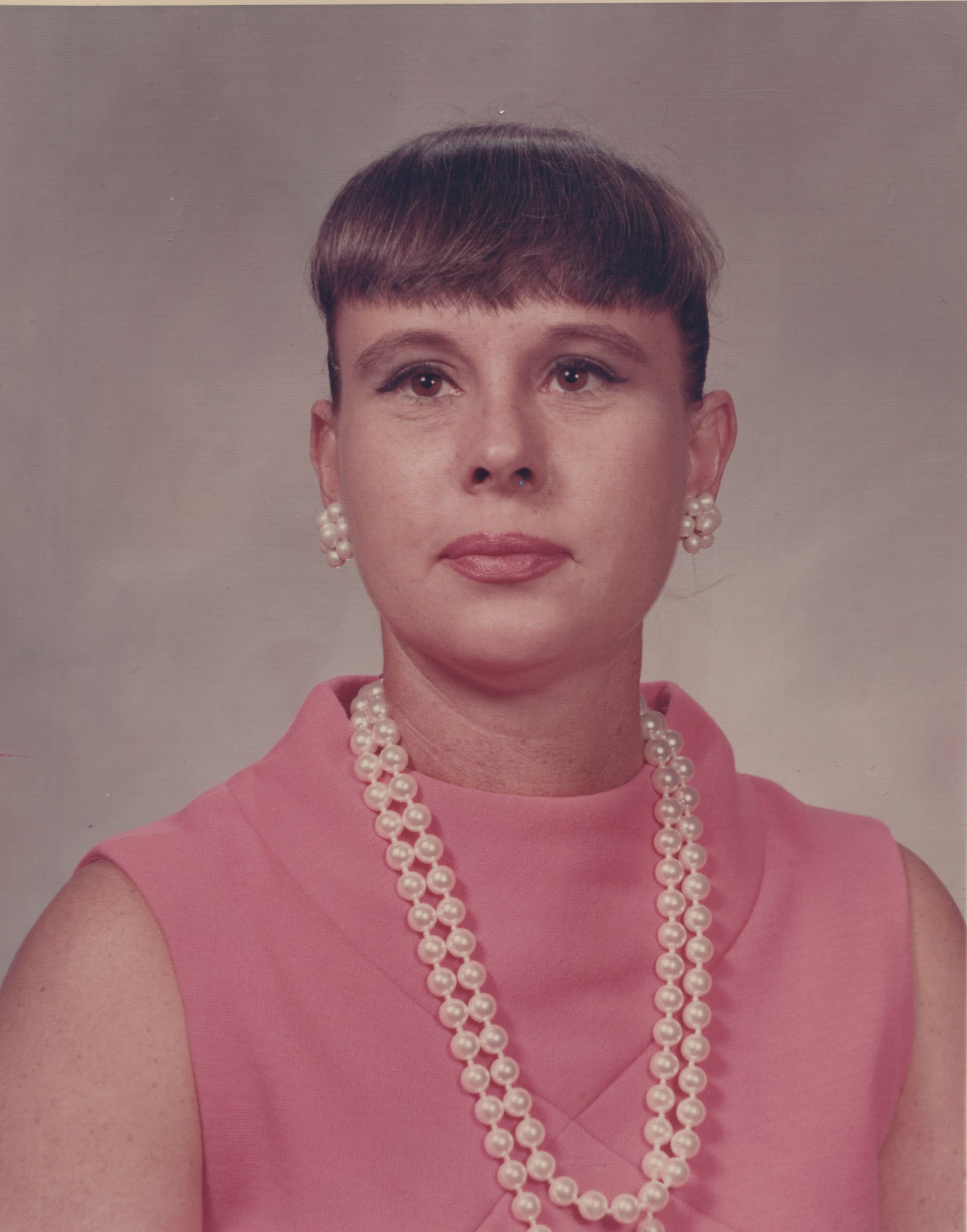 A woman wearing pearl necklace and earrings in a pink dress.