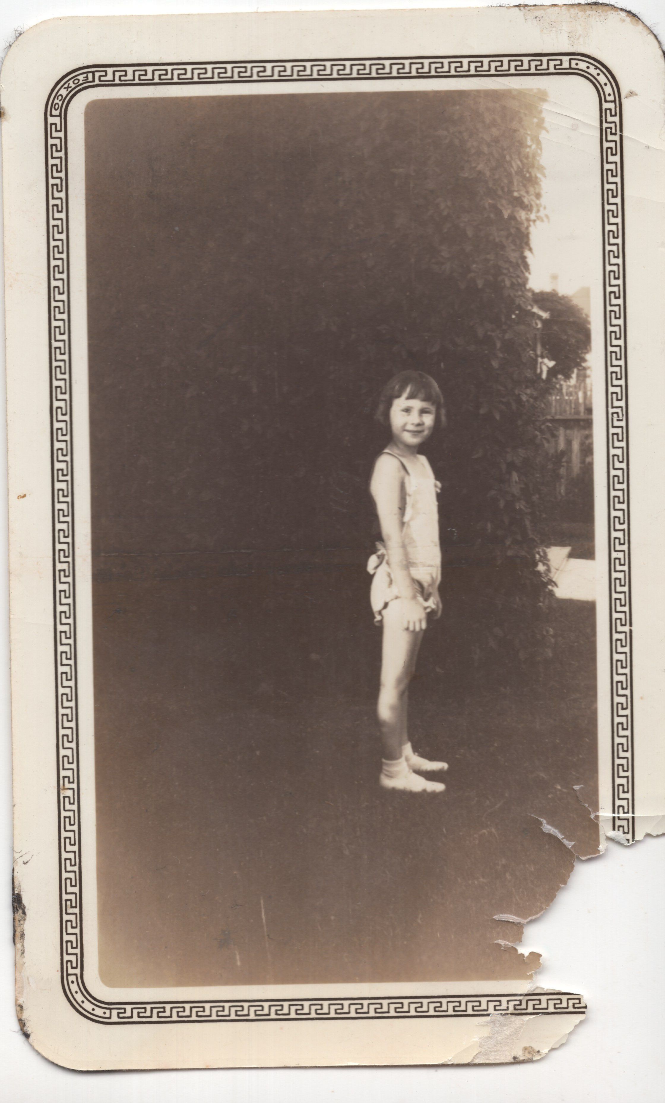 Claire Joy in either a swimsuit or summer clothes in what was probably her backyard as a child