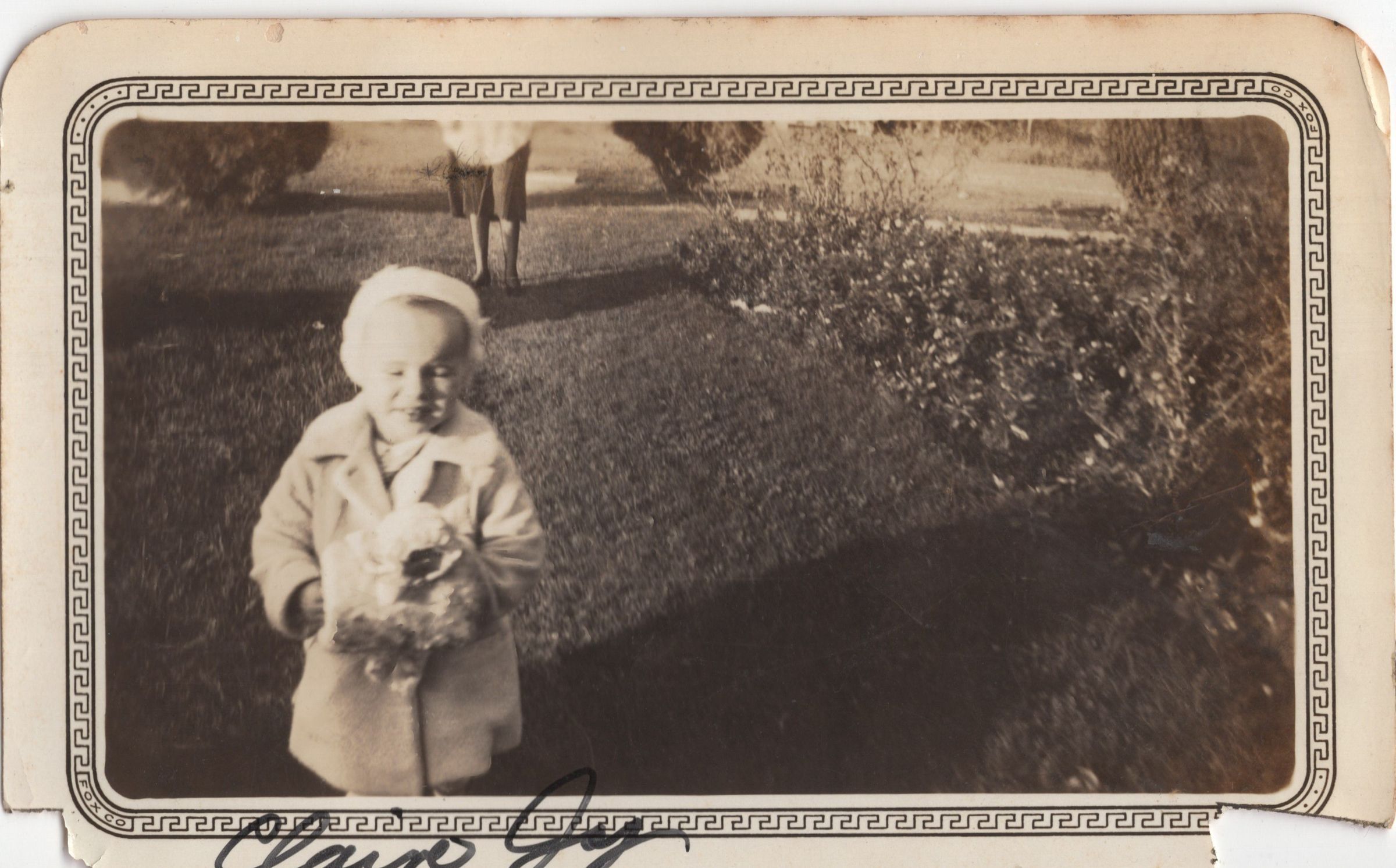 A young Claire Joy wearing a winter coat in the garden