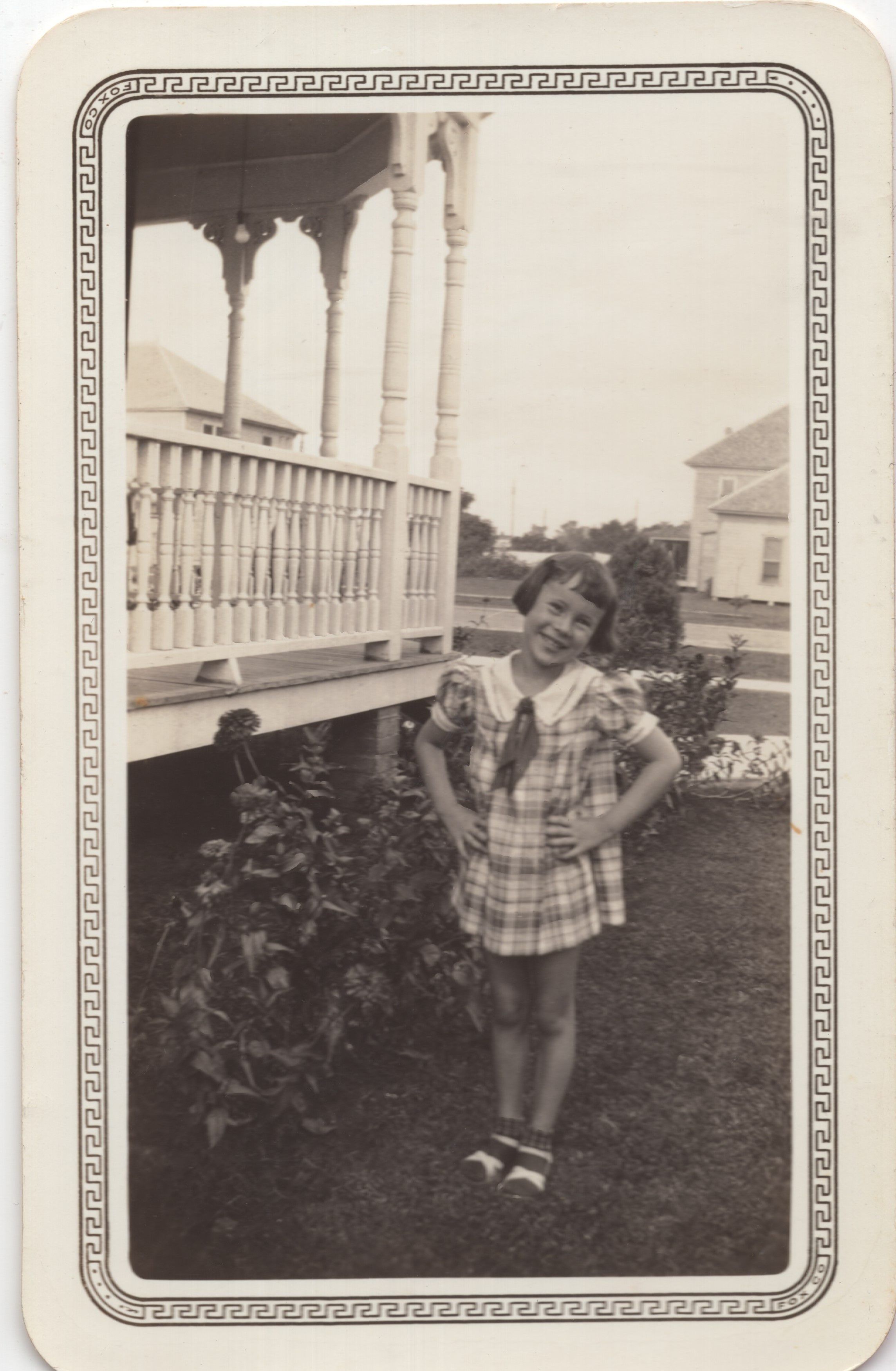 Claire Joy in a plaid dress standing be the porch railings of the Luther Family Home on the corner of 4th and Welch.