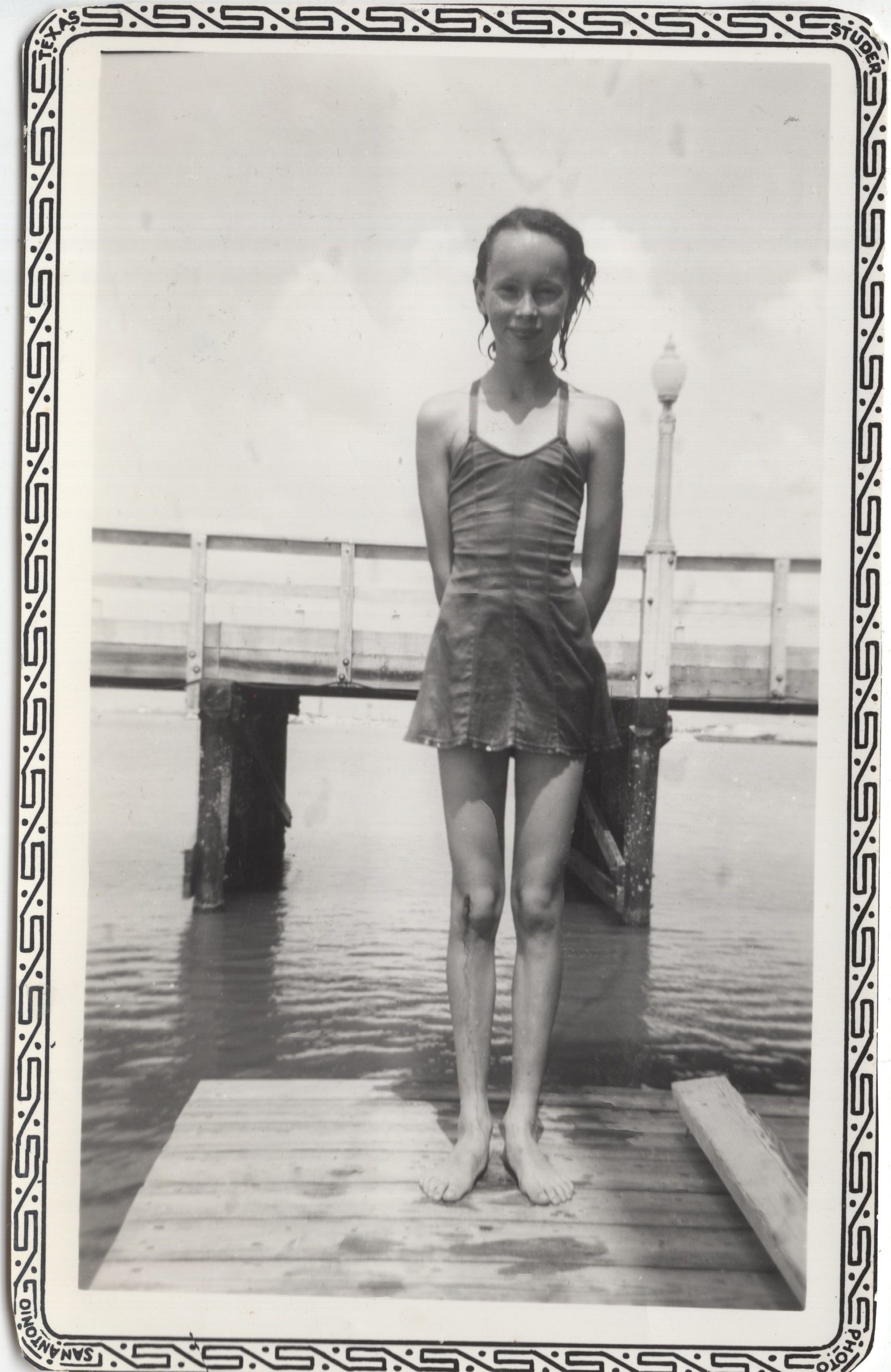 Claire Joy in a swimsuit on the pier next to the Pavilion Pier.