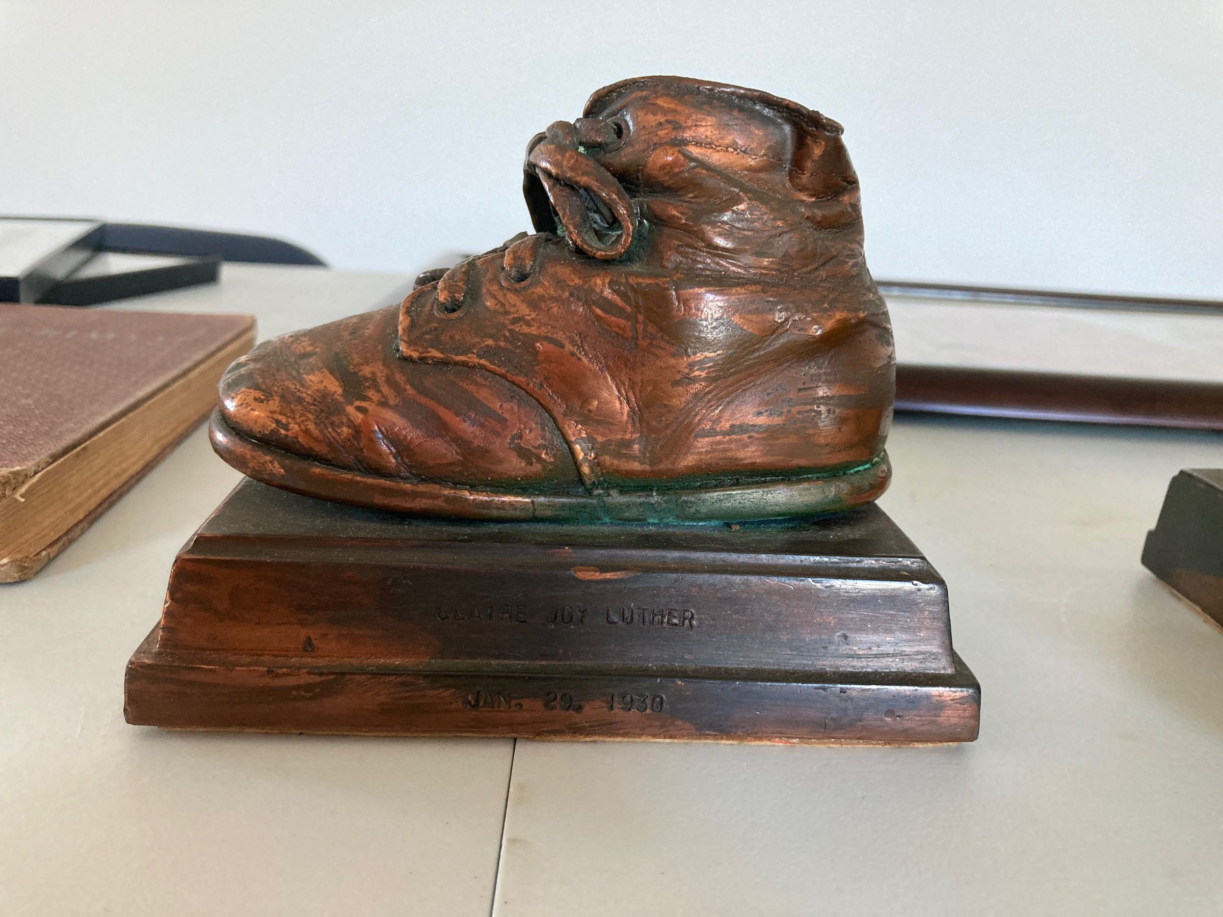 Claire Joy Luther’s baby shoes were dipped in bronze. Claire Joy Luther January 29, 1930