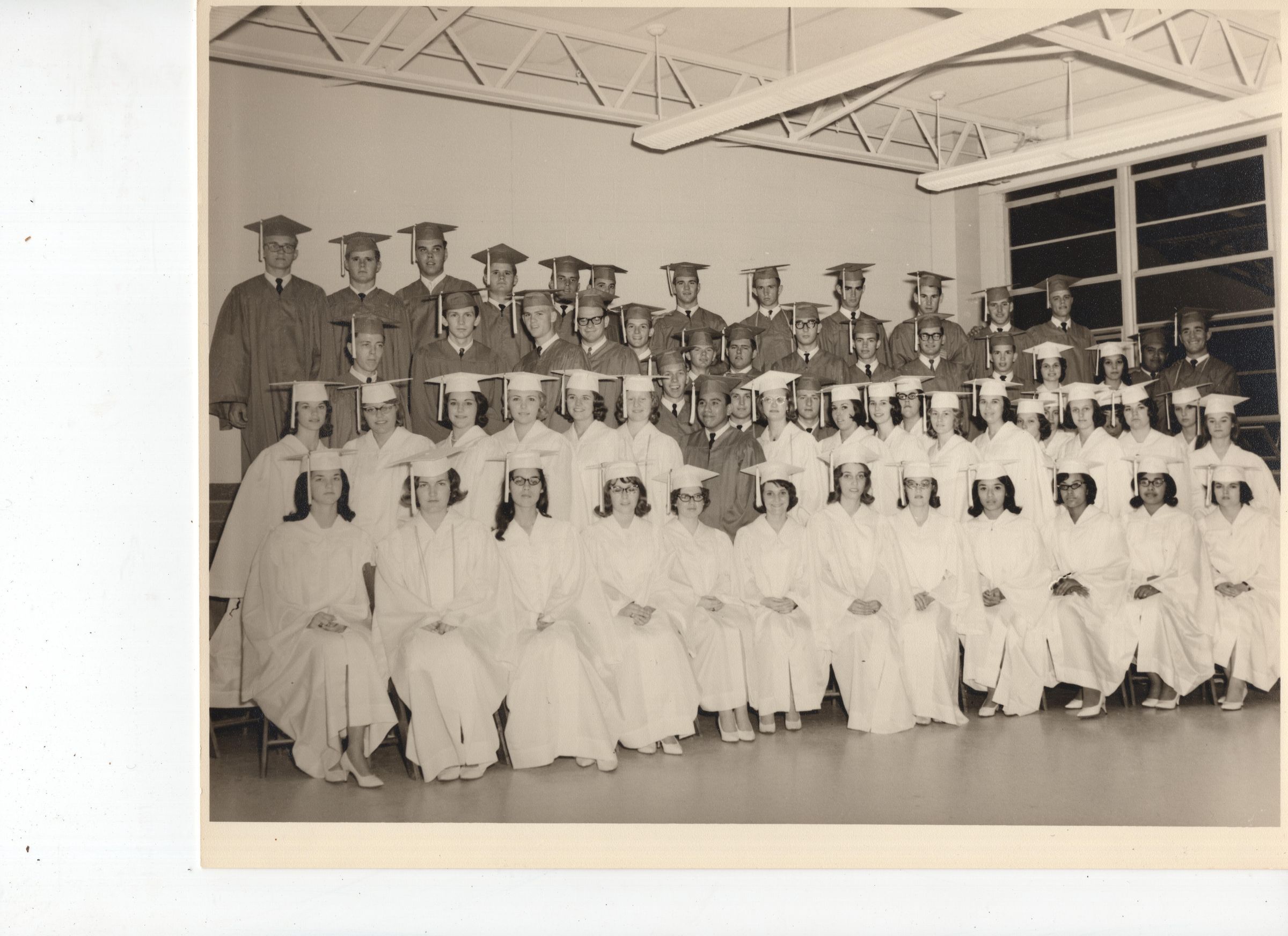 Palacios ISD Class of 1965 Graduation Night. The women are wearing white gowns while the men are wearing red gowns.