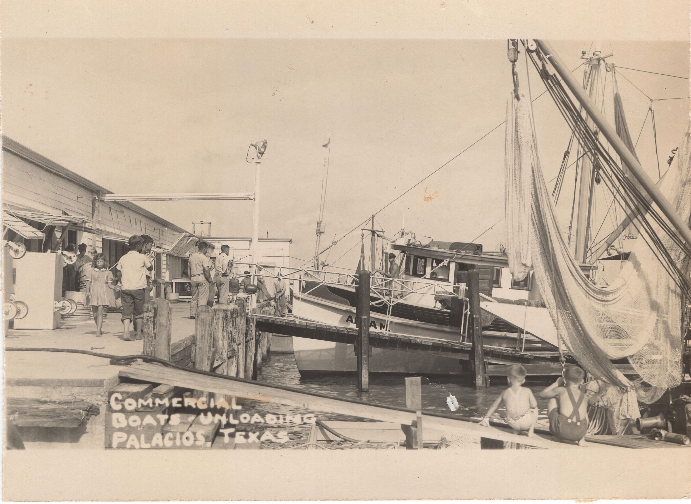 Children and men watching the boats unload with their haul. One of the boats docked is "A--A M"