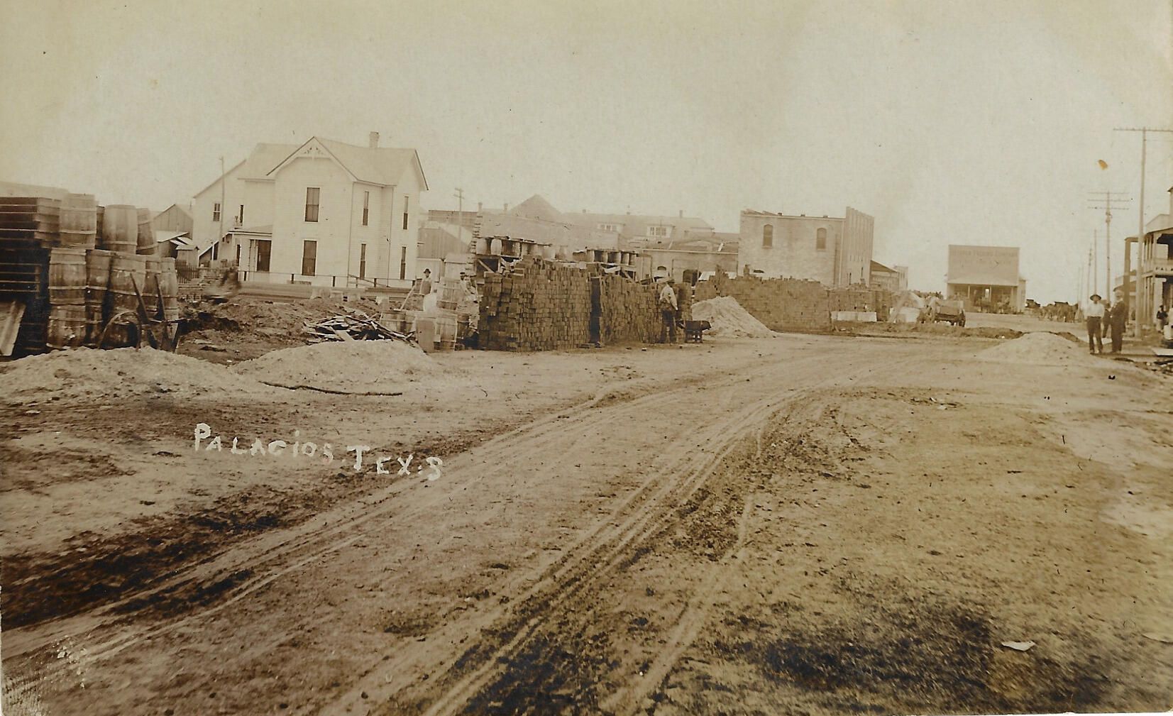 The view is of 5th Street with bricks stacked up and barrels off to the side.