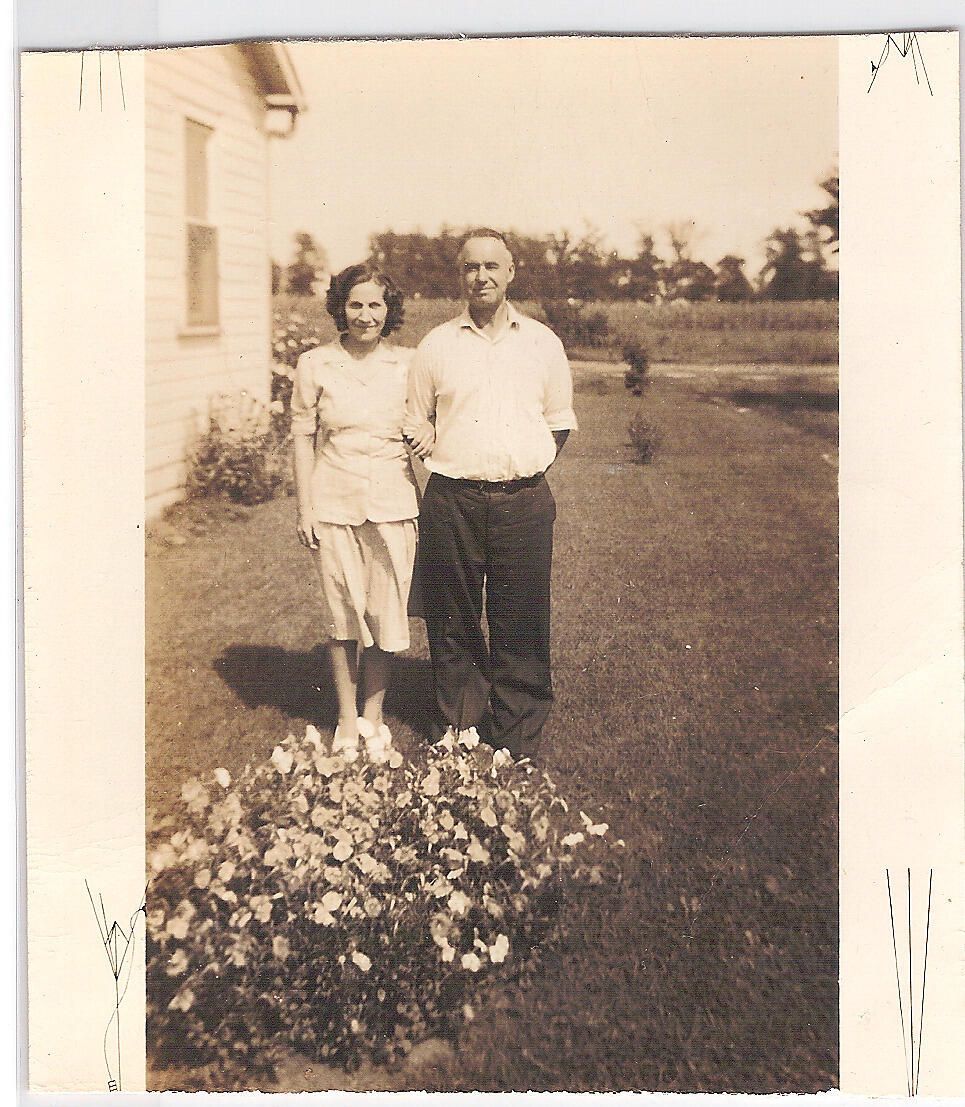 Photo of couple in yard beside home.