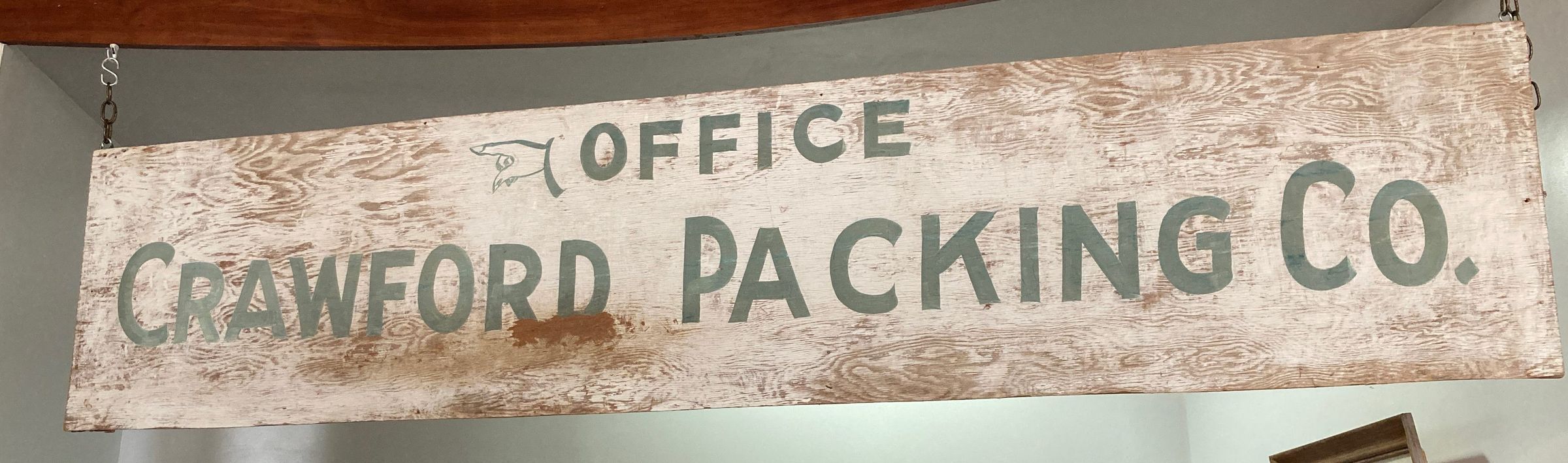 A Wooden hanging sign with faded white paint and green or blue lettering with hand pointing OFFICE and "CRAWFORD PACKING CO."
