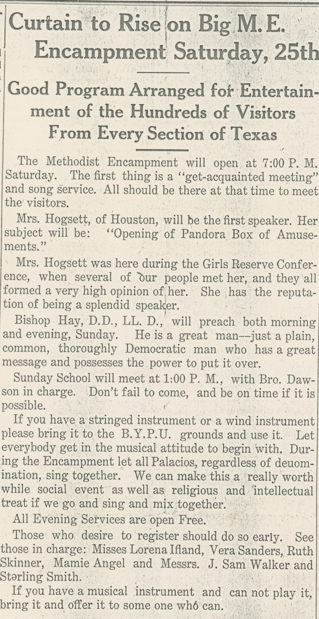 Curtain to rise on big M.E. Encampment Saturday, 25th