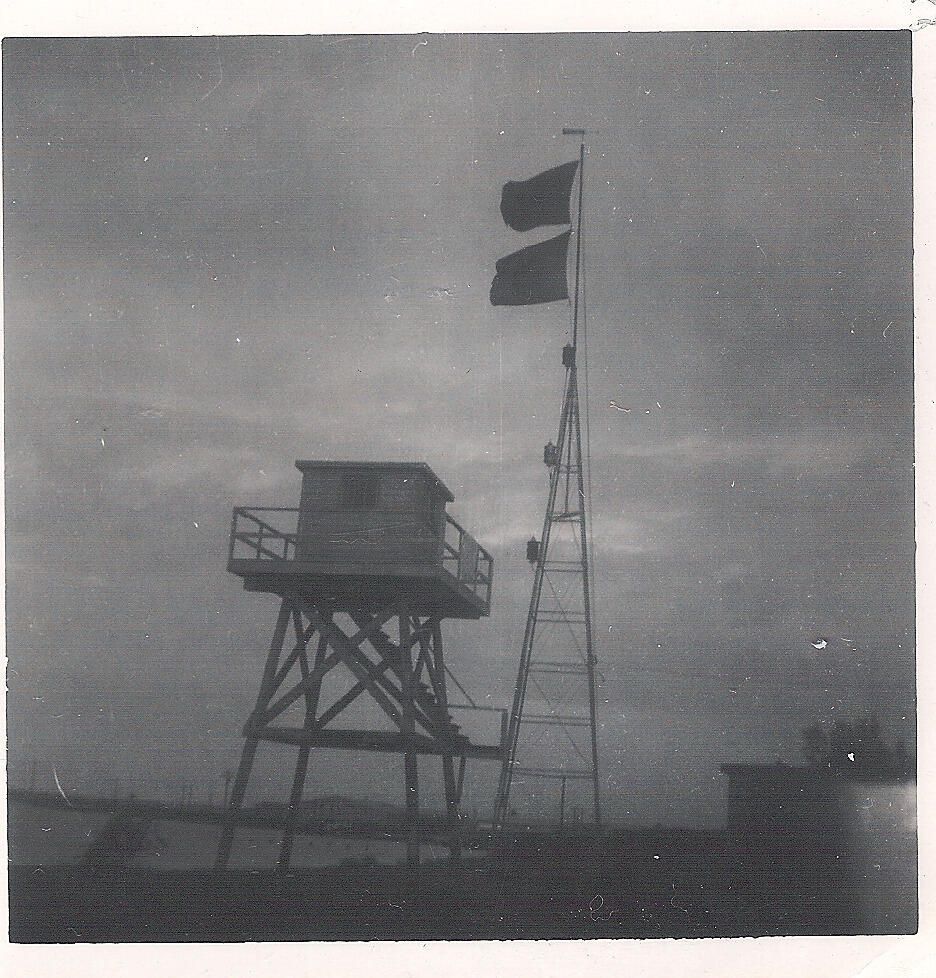 Weather tower & flags, foot of Sixth Street Flags: Black square on red.