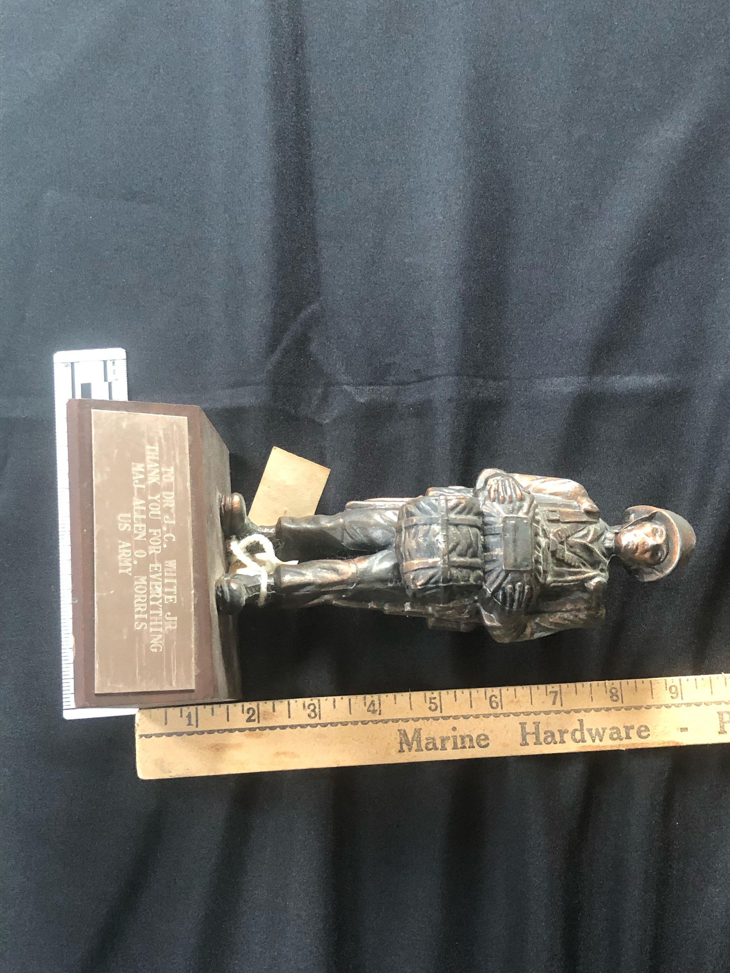 9 in. tall award to Dr. J.C White Jr from Major Allen Morris from the US Army. It shows a soldier holding what appears to be a bedroll and a duffle bag with a backpack on its back in full uniformCollection