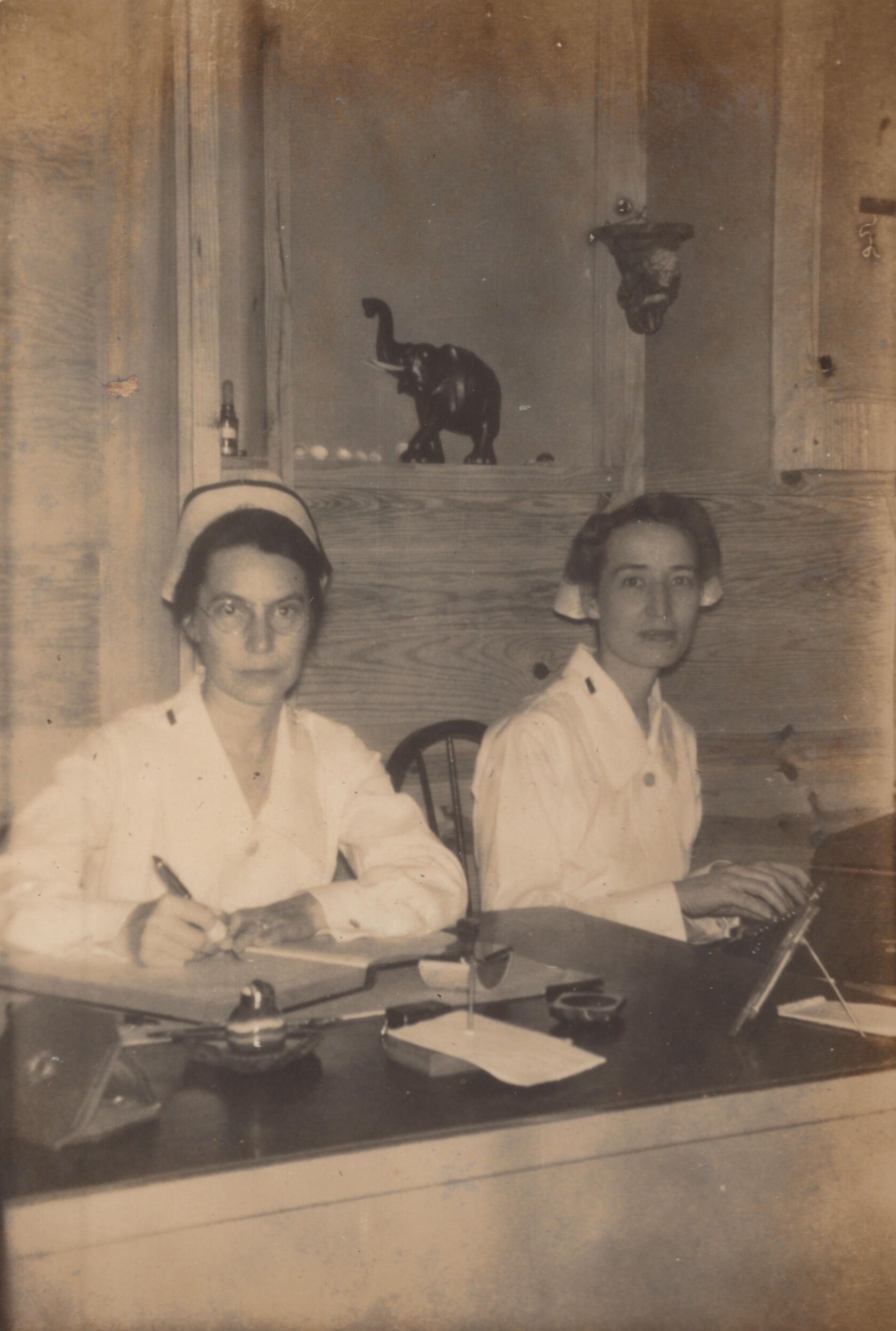 2 nurses sitting at desk completing reports.