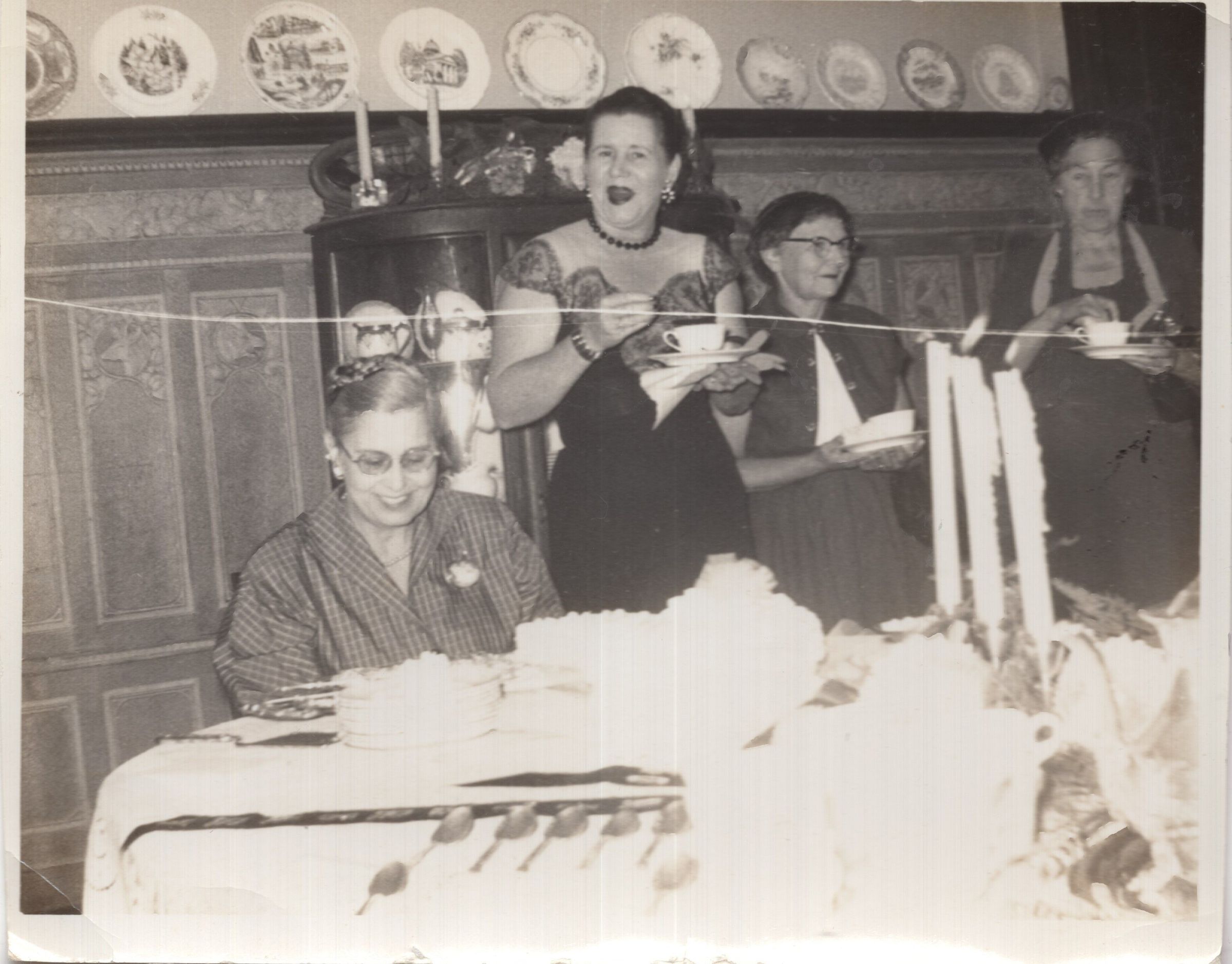 Elsie surrounded by women at a dinner party, drinking tea, possibly a birthday party