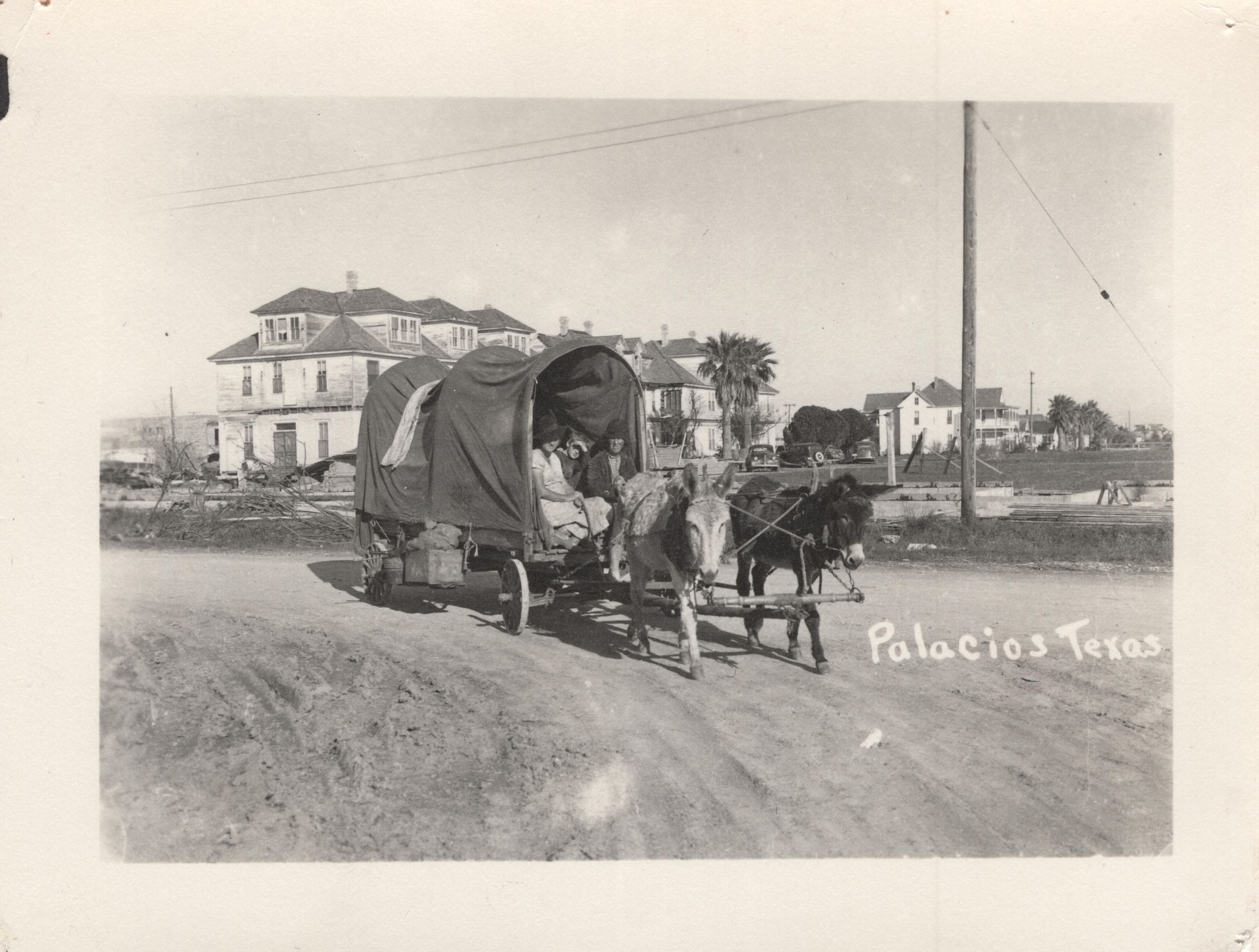 Donkeys pulling wagon carrying a family. In the background is Hotel Palacios in disrepair.