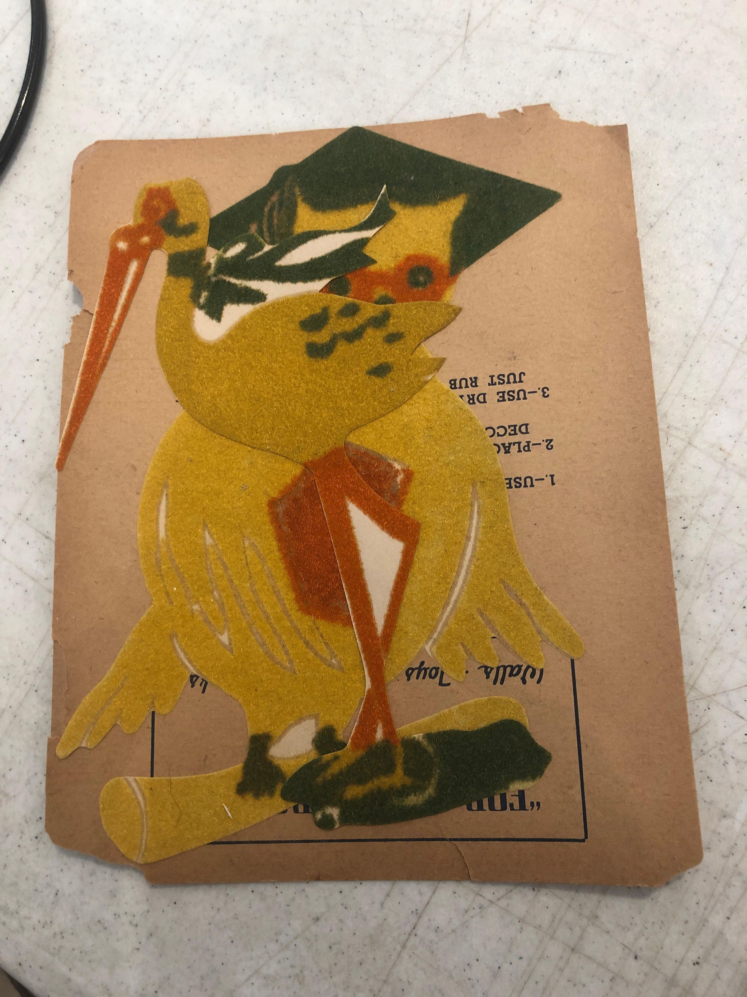 Décor sticker from "Flockies" : "The Feel Appeal". There are two stickers on this paper, one on top of the other. One is a yellow crane and the other is a yellow own with a green graduation cap. The directions on how to apply the stickers are underneath the owlCollection