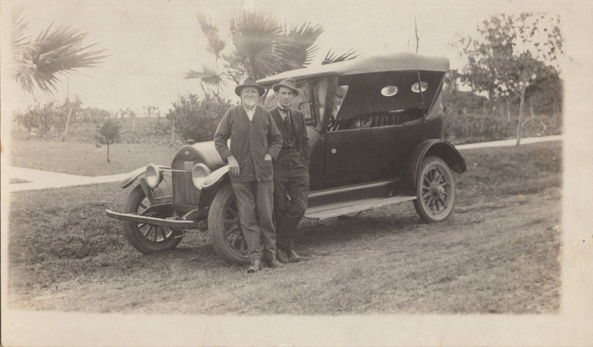 J.H. Foley and Ruel Foley standing in front of car.