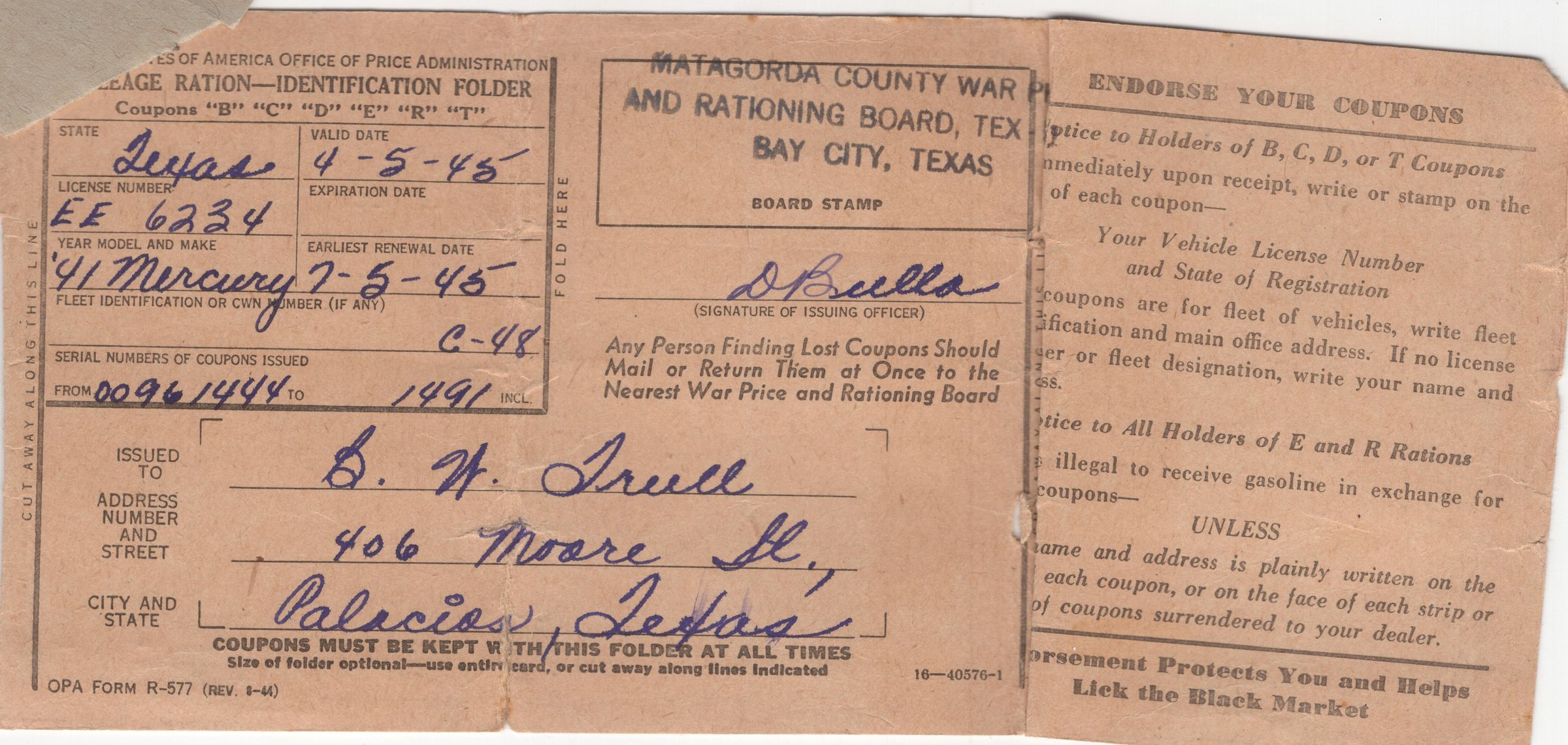 Matagorda County War Price and Rationing Board, Tex-56161 Bay City, Texas Car Model and Year: 41 Mercury