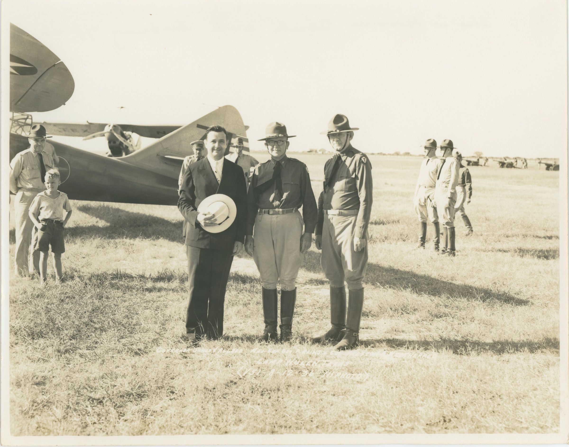 Governor Allred, General Hulen, and an officer at Camp Hulen. possible loan from Navigation District.