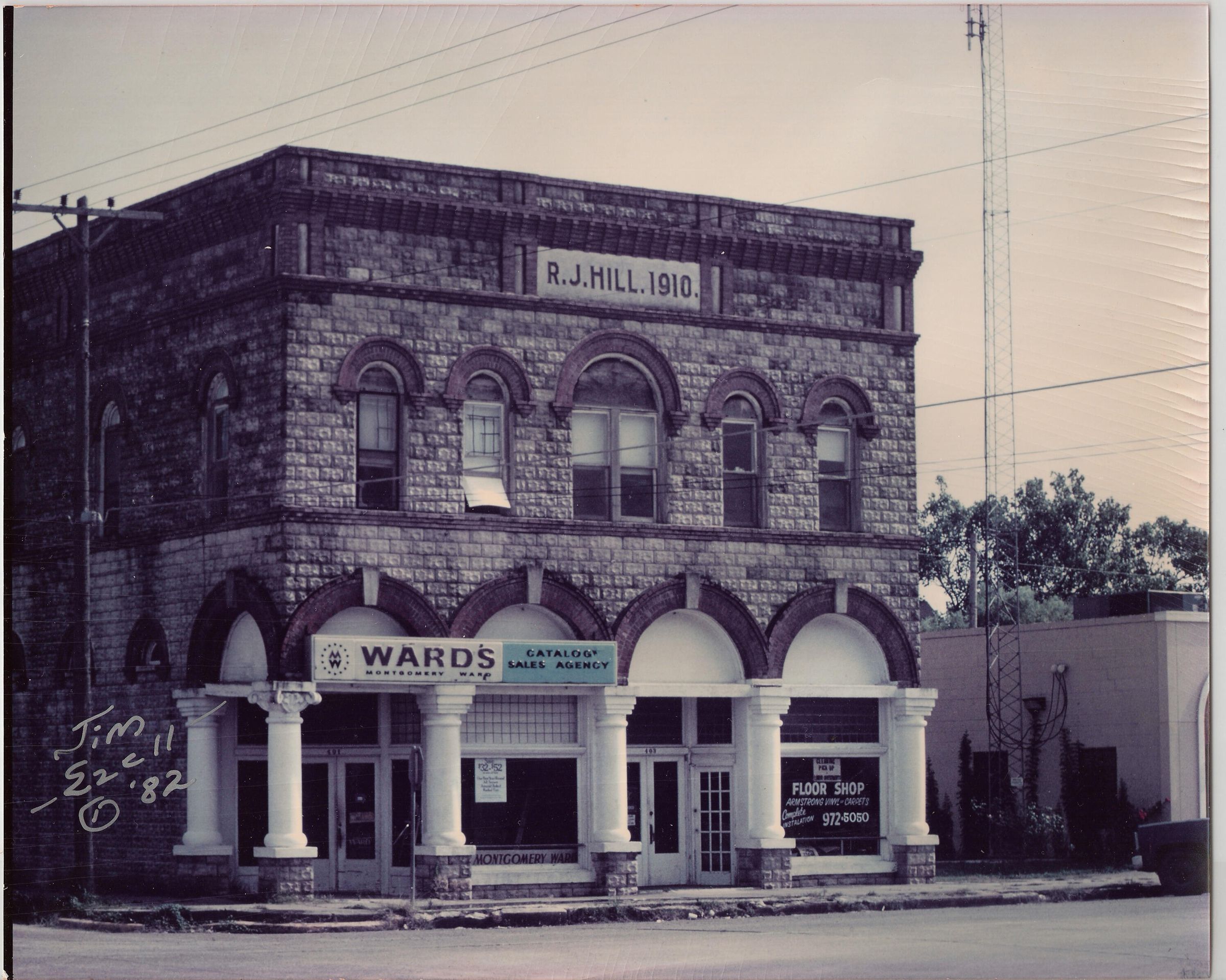 HILL BUILDING, FRONT VIEW, MONTGOMERY WARDS CATALOG SALES AGENCY JIM EZELL '82 FLOOR SHOP ARMSTRONG VINYL CARPETS 972-5050