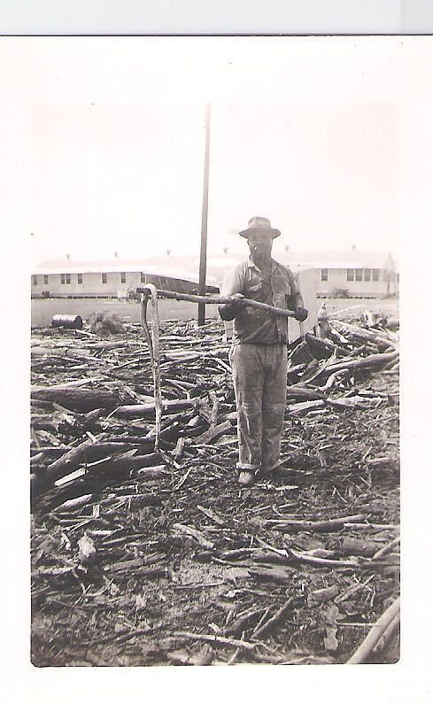 1942 Hurricane damage. Man holding 4ft Rattlesnake