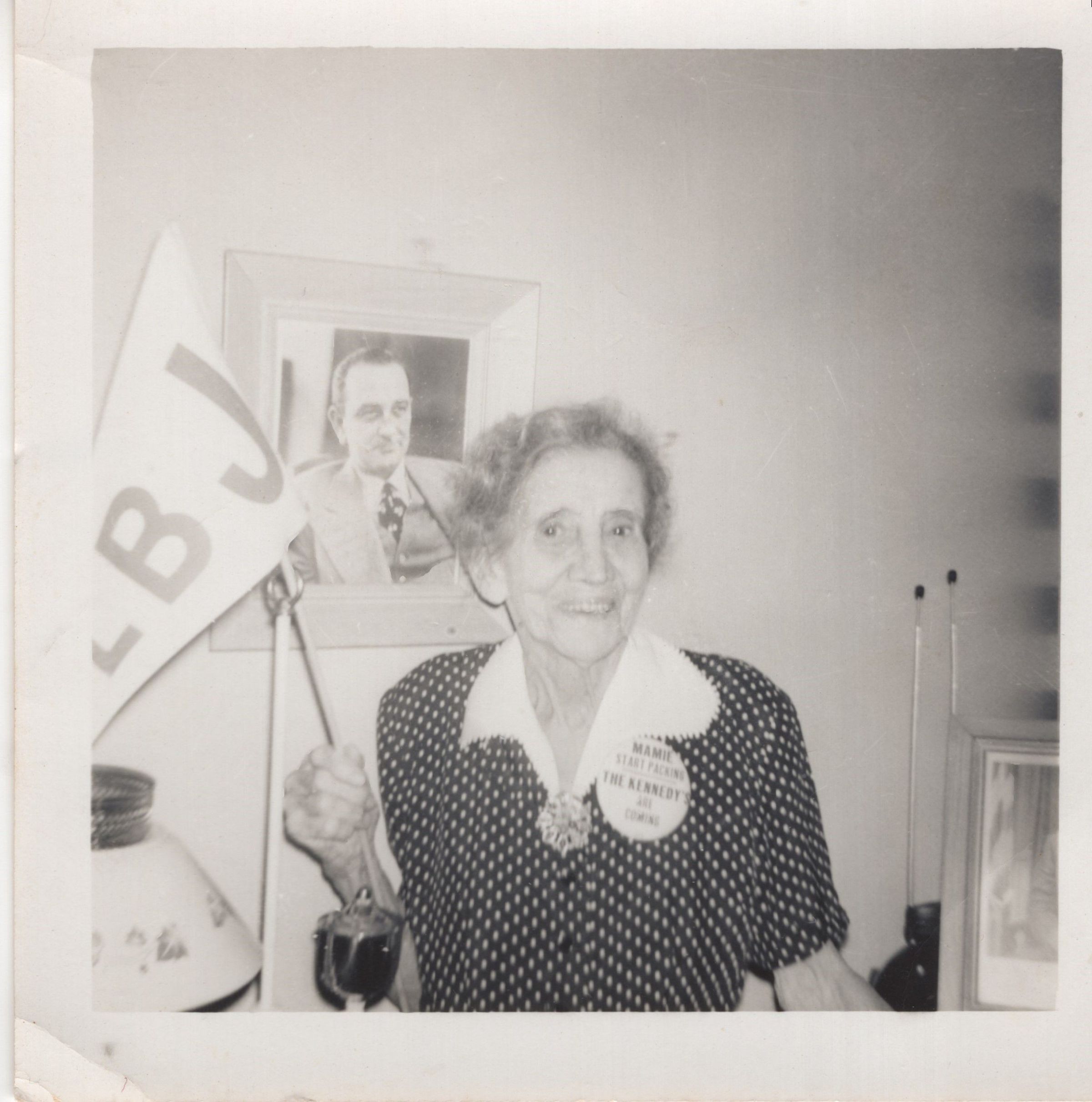 Ida May Callaway standing in front of a picture of Lyndon Baines Johnson while holding a LBJ flag.